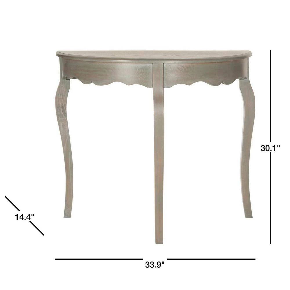 With graceful cabriole legs and sweet scalloped apron, the Aggie console by Safavieh adds subtle sculptural interest to transitional rooms. Shown in pine with a dark teal finish, this feminine Demilune table is perfect for an entry hall or living room. Dress Aggie with a pair of lamps or vase filled with flowers for added charm.