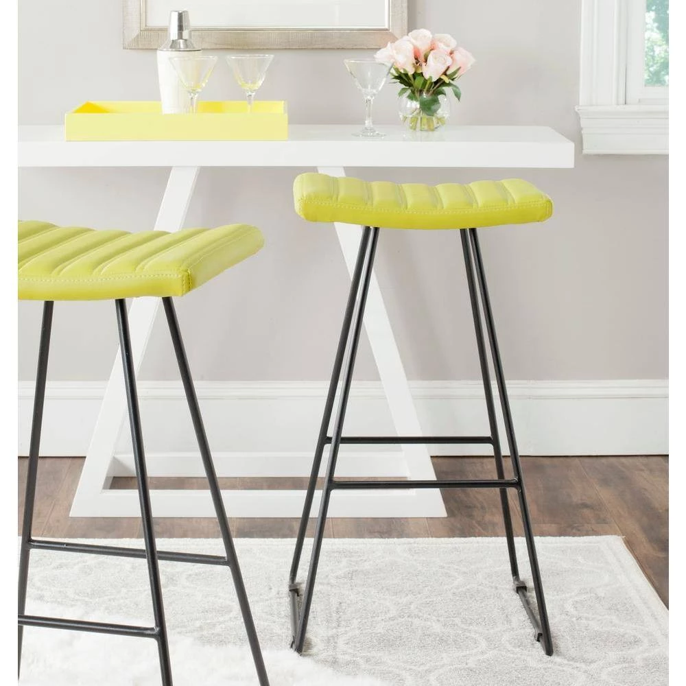 Count on the Safavieh FOX Bar Stool to add a sleek, dynamic look to any home decor. This backless stool will perfectly fit beneath the counter or bar. Featuring a modern style, this stool is great for revamping your current interior design. It has a metal frame, making it able to withstand everyday wear and tear, so it will last for many years. It has a faux leather seat, which is stylish and has the appearance of genuine leather. The cushion features a green color, bringing a fun and vibrant atmosphere into the room. Featuring a strong construction, this stool is a reliable choice for your kitchen decor since it will stay in good condition for a long time.