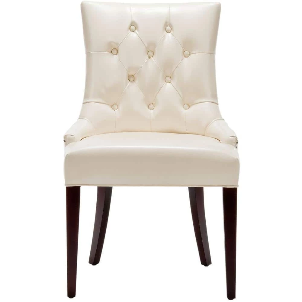 A buttoned-up elegance infuses the flat cream leather upholstered Amanda Chair. A high back, curved rear legs and modest sloped arms produce a sophisticated profile at home in formal settings. Legs are in a cherry mahogany finish. This is a great addition for your home whether you live in the country side or the busy city.
