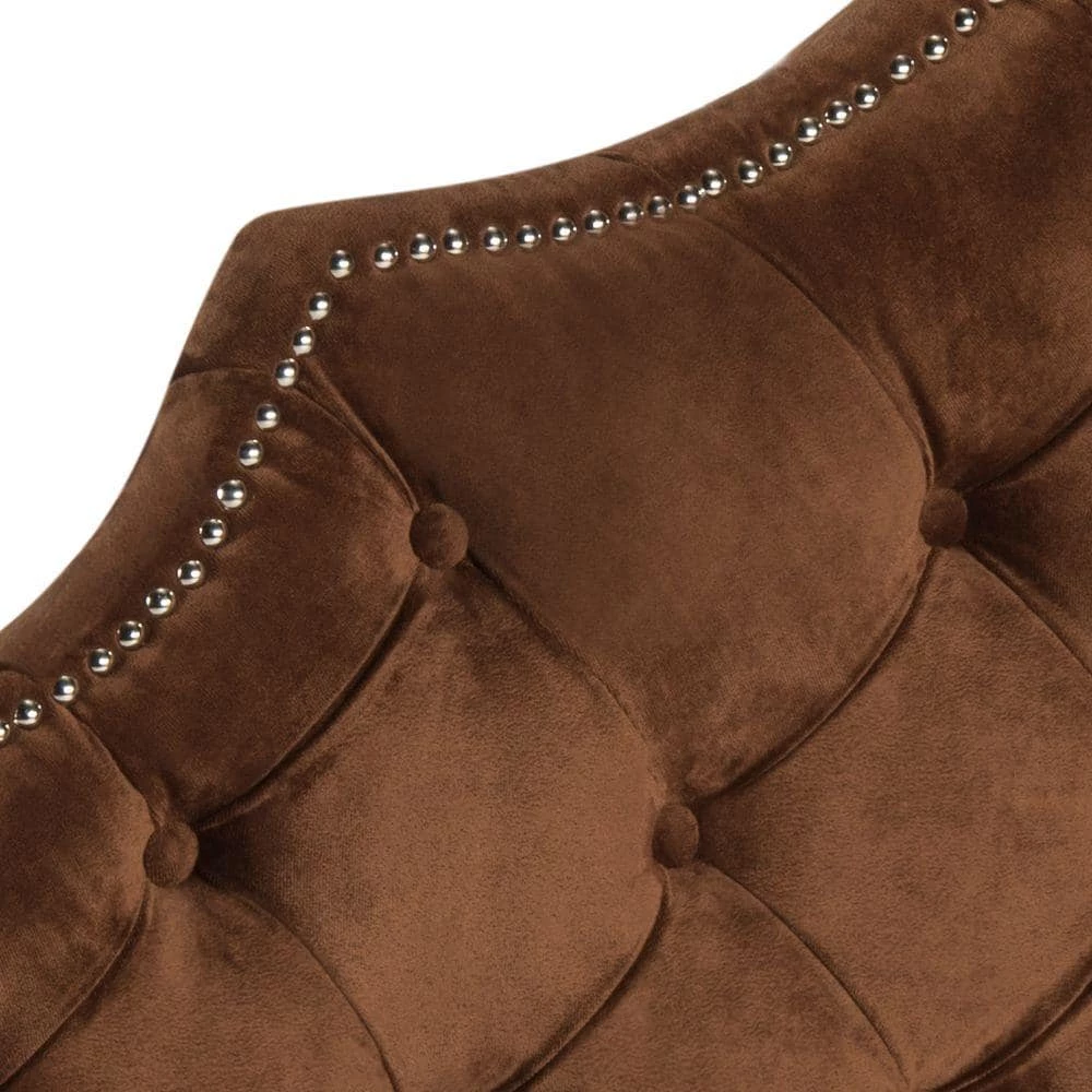 Furnishings that outfit the hotel suite that’s a second home to the residents of Buckingham Palace inspired this tufted velvet headboard. Designed for the boudoir of the modern princess. Its chocolate upholstery is adorned with polished nailhead detail.