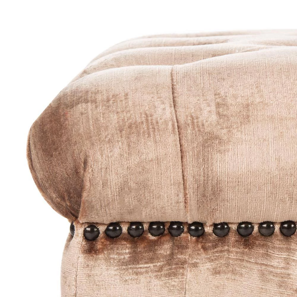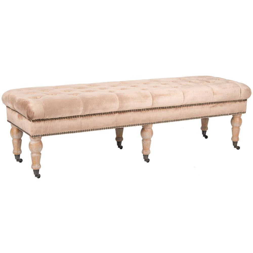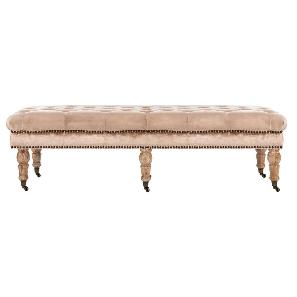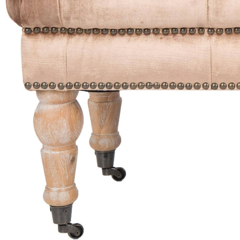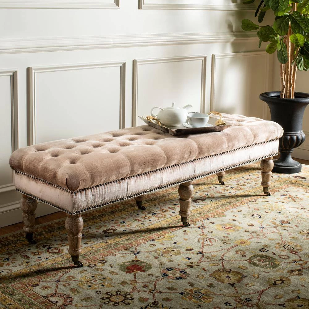A touch of luxury at the foot of a bed or topped with a tray for use as a living room table, the Barney Bench by Safavieh is the epitome of transitional style. Mink brown velvet upholstery is softly button tufted for plush comfort, and brass nail head trim gives a rich designer look. Beautifully turned pickled oak legs are on casters for mobility anywhere you need an extra perch.