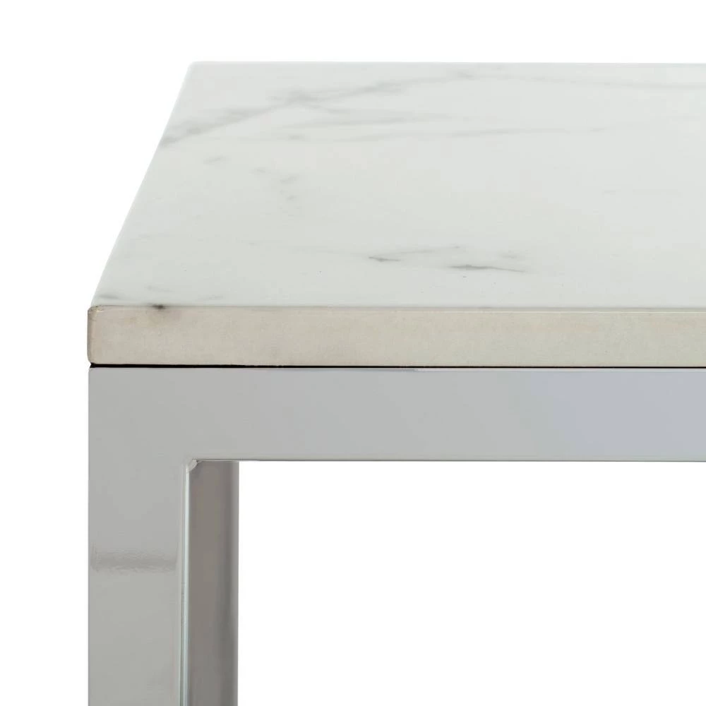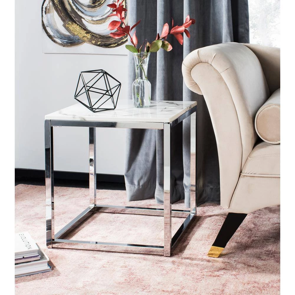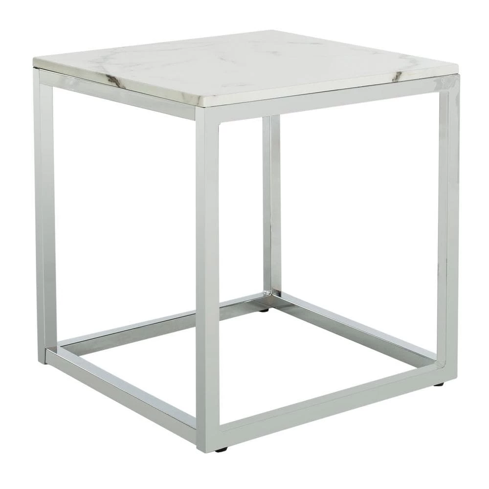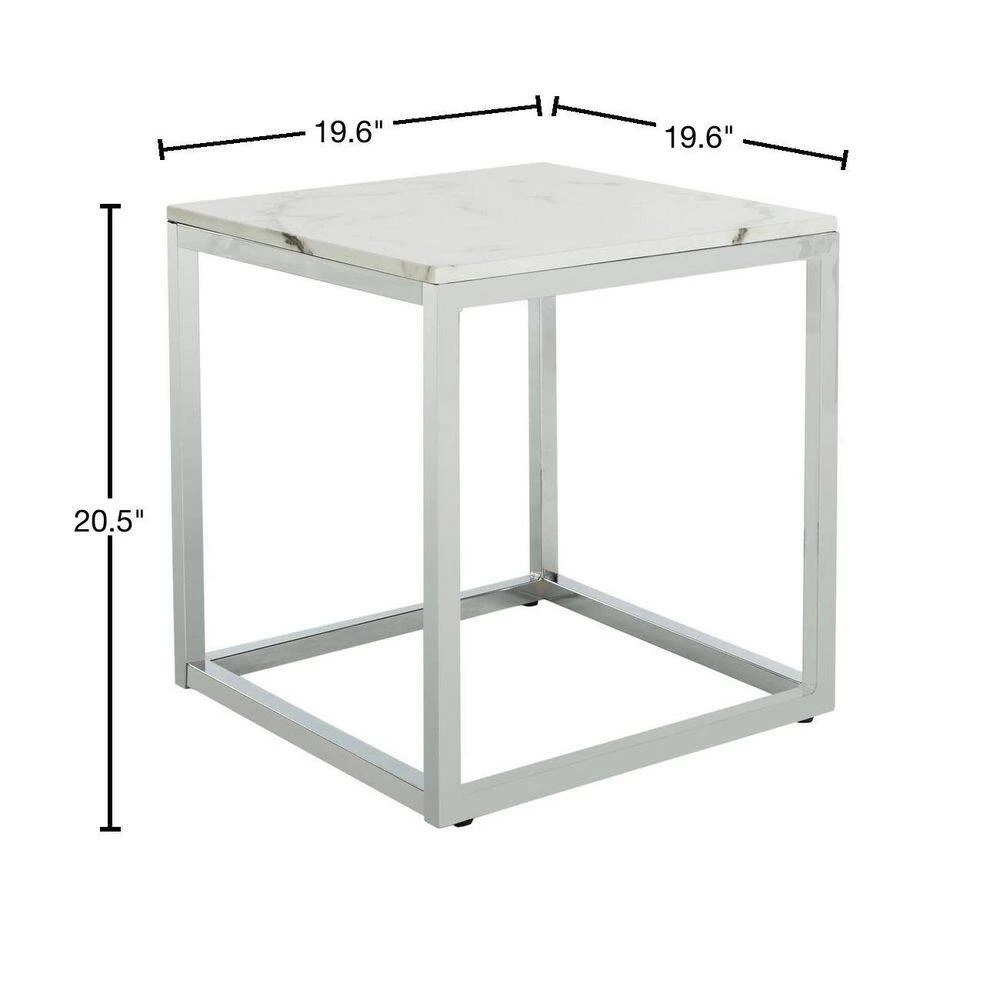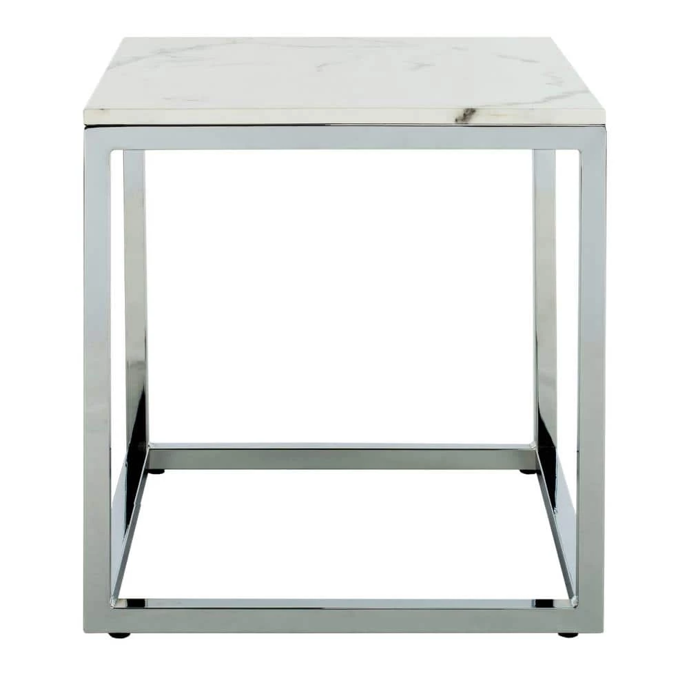Bring cutting-edge contemporary style to the living room with this square end table. Its smooth minimalist wood surface features a white marble finish that complements its classic chrome finish, while illuminating the clean lines of its geometric base. This is a great addition for your home whether you live in the country side or the busy city.