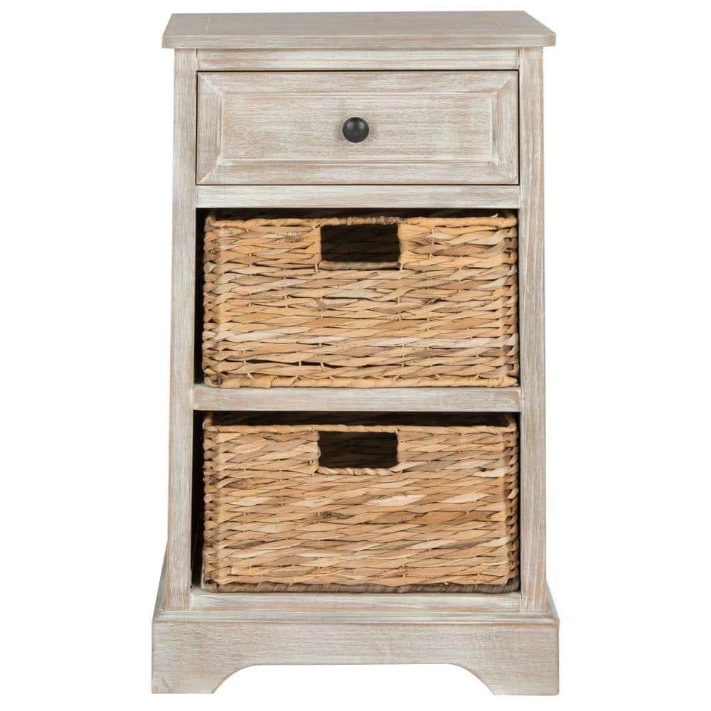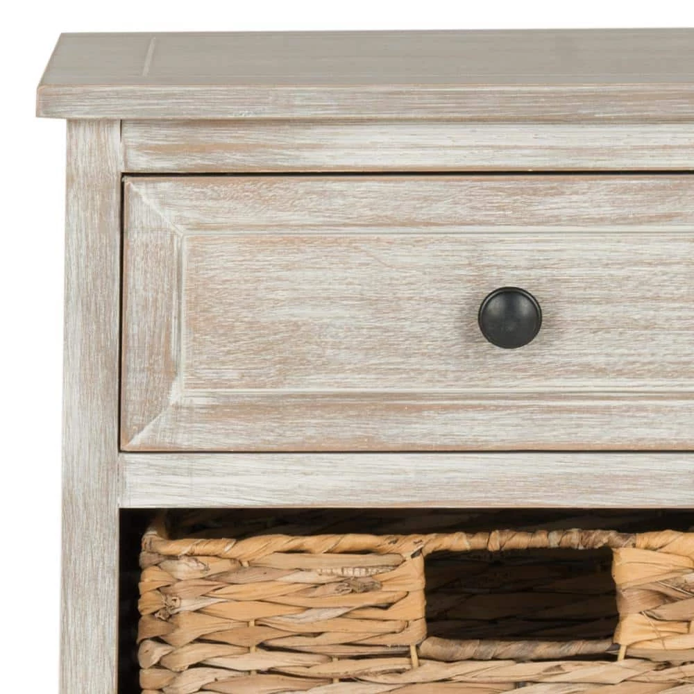 A carefree spirit infuses Carrie thanks to the side table’s thoughtful design. 1-Drawer for easy storage and 2 removable woven rattan baskets with cutout handles make de-cluttering and cleanup a breeze. Handsomely crafted of pine with white washed finish, the Carrie Storage Side Table brings a touch of classic island style to your bedroom, living room or master bath.