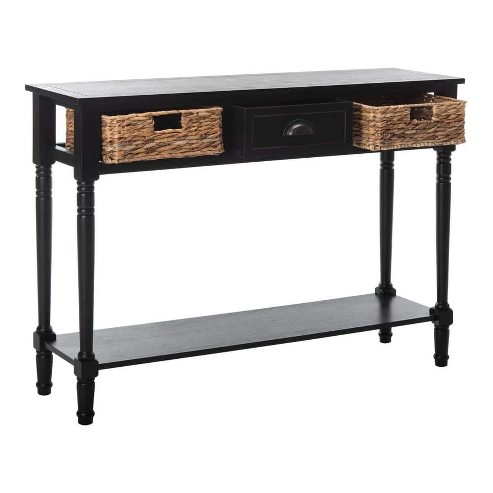 From coastal cottage to rustic lodge, this pretty vintage distressed black console lends welcoming charm to an entry hall and makes a wonderful focal wall in a living or family room. With rattan weave drawers and lower shelf, it is a canvas for accessorizing. It is a perfect companion for country homes, city apartments or formal manors.