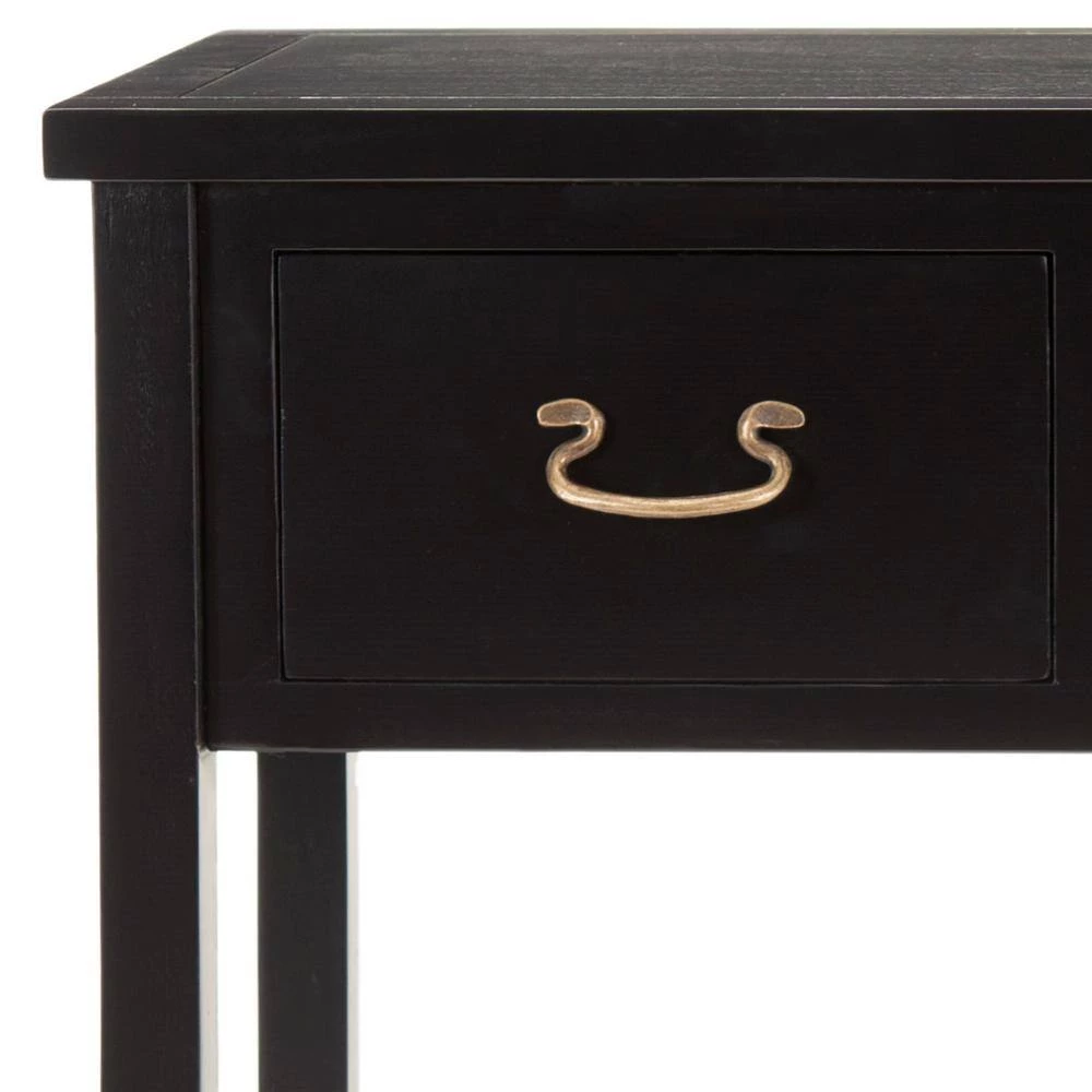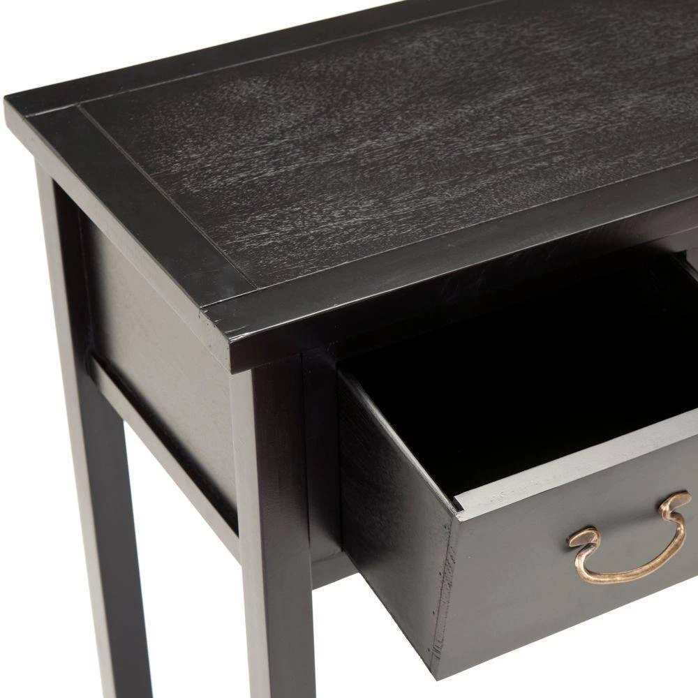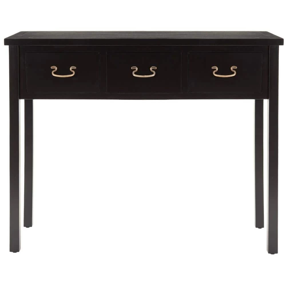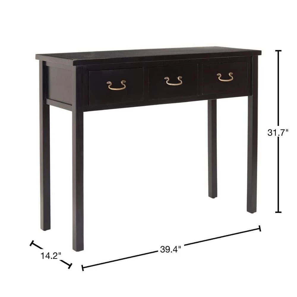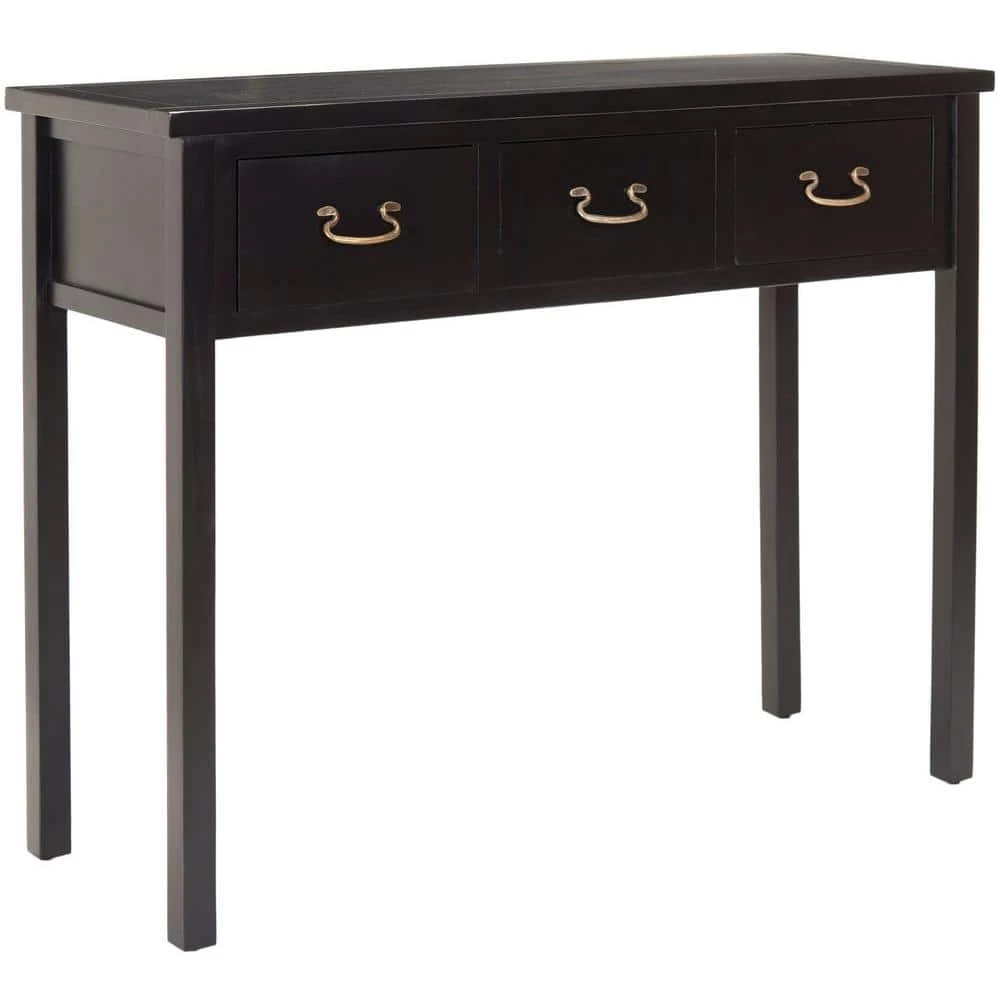 The Cindy console, with slightly tapered legs, just right black finish and 3-drawers for stashing, has a basic, easy-going appeal. Perfect for country, beachy or casual settings. The console is crafted from pine. It is a perfect companion for country homes, city apartments or formal manors.