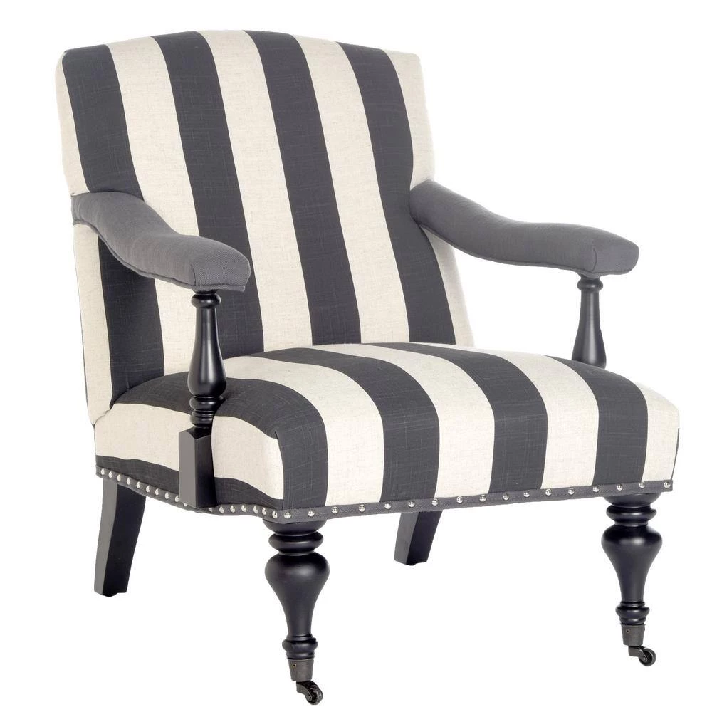 Inspired by a 17th century antique found in Madrid, this armchair is a contemporary classic. Its striking traditional frame is paired with impeccably tailored charcoal and white awning striped upholstery and finished with polished silver nail heads. Use this classic beauty in pairs at either end of a dining table or in the living room on either side of a sofa.