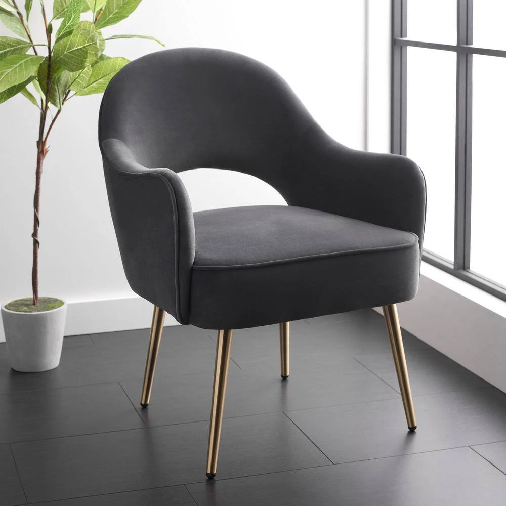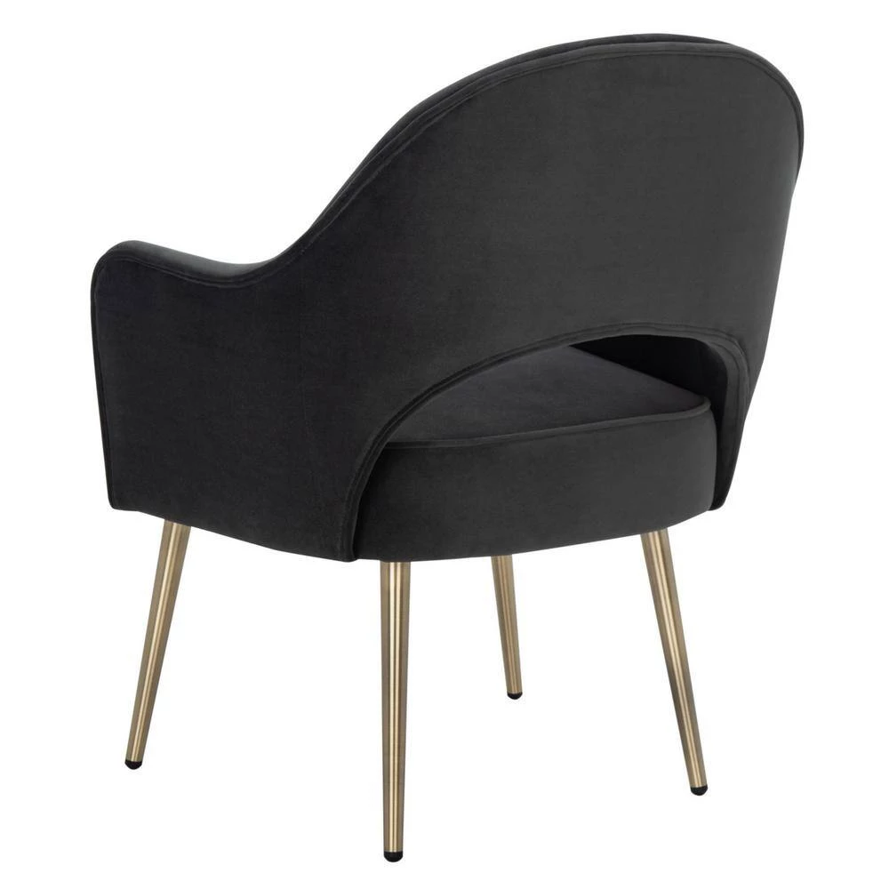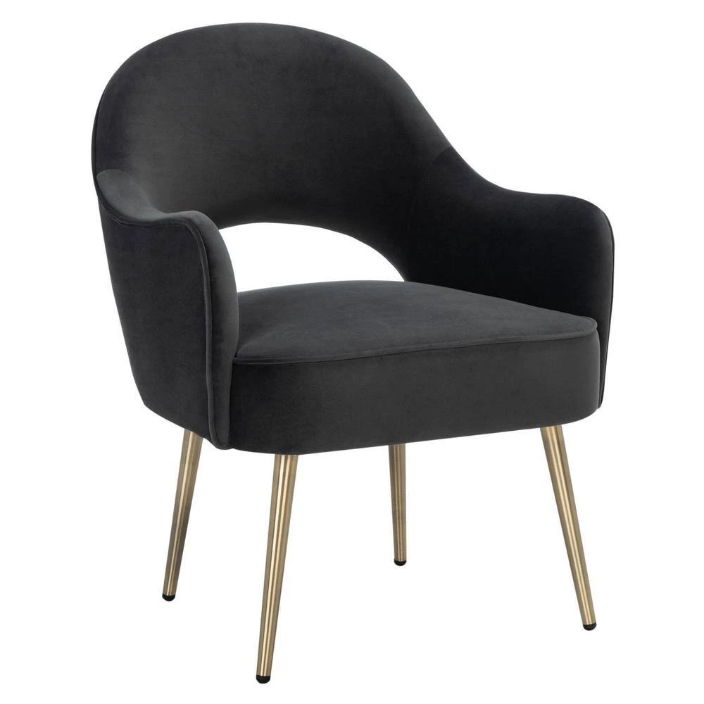 A glamorous modern take on retro charm, this Dublyn Accent Chair abounds with fashion-forward appeal. Dublyn redefines the classic club silhouette with a cut-out back and gently sculpted arms in luxuriously soft black velvet, while tapered gold metal legs complete the look. This is a perfect addition to any home.