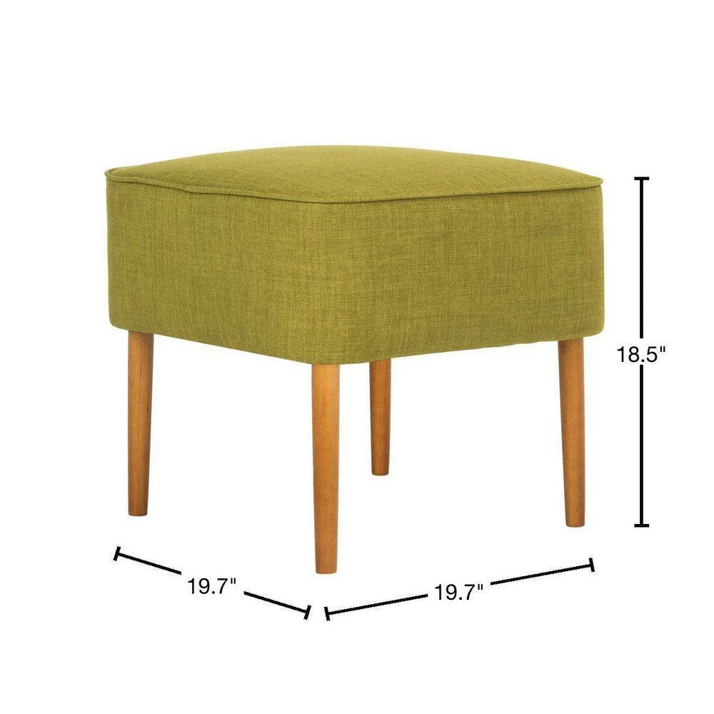 A diminutive footstool with natural oak -finished spindle legs inspired by Mid-Century Modern chairs, the Eli ottoman is the ideal solution for bedroom, bath or apartment living room. Covered with sweet pea green fabric in a blend of polyester and organic vicose and detailed with self-binding, the Eli square ottoman looks great tucked in pairs under a console. It is a perfect companion for country homes, city apartments or formal manors.
