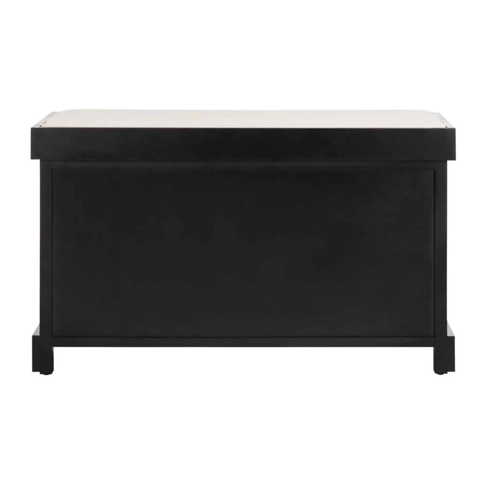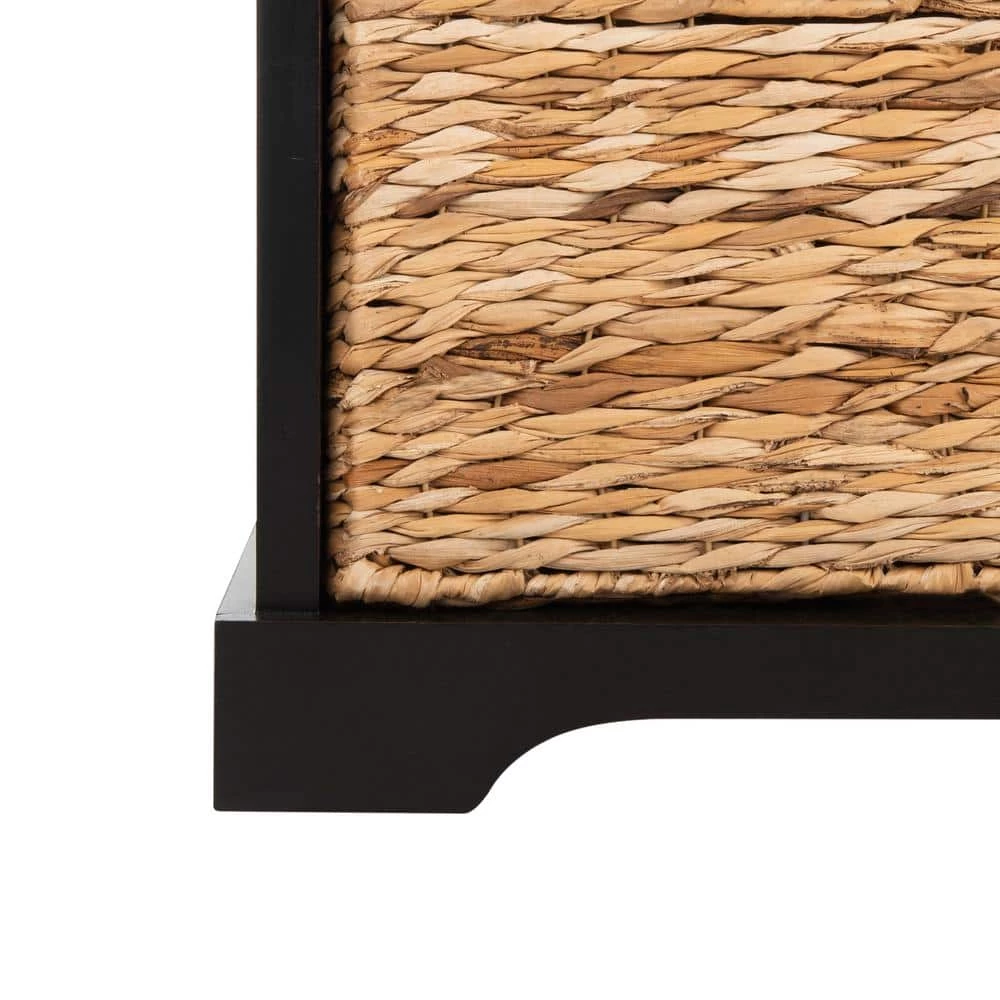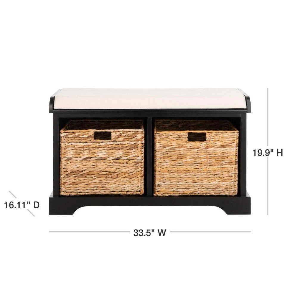 Sit back and relax. This charming storage bench with distressed black pine wood frame and linen upholstered seat is perfect for changing shoes in entry hall, and its woven baskets can hold towels and other necessities in a master bath. A versatile piece in any room.