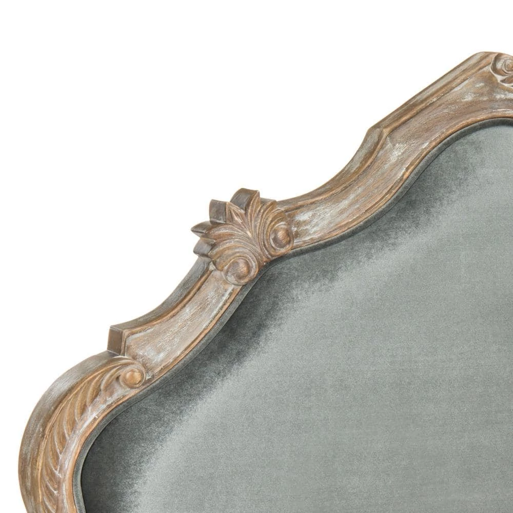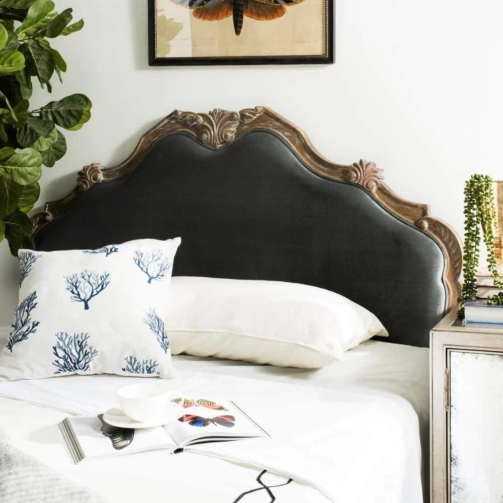 The indulgence and glamour of Old Hollywood inspired this romantic headboard. Designed with soft curves, its rich rustic oak frame features meticulously carved details and timeless grey linen upholstery- transforming any bedroom into a luxury suite. This is a perfect addition to any home bedroom decor.