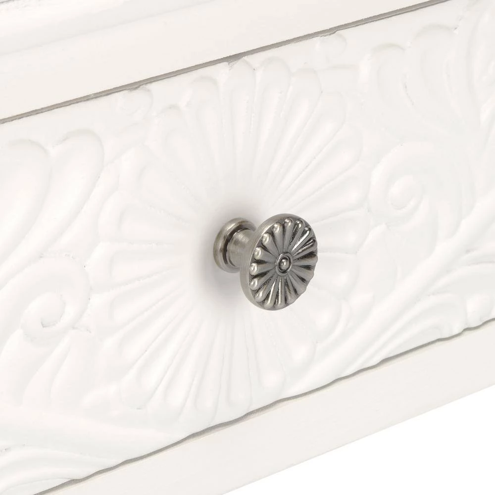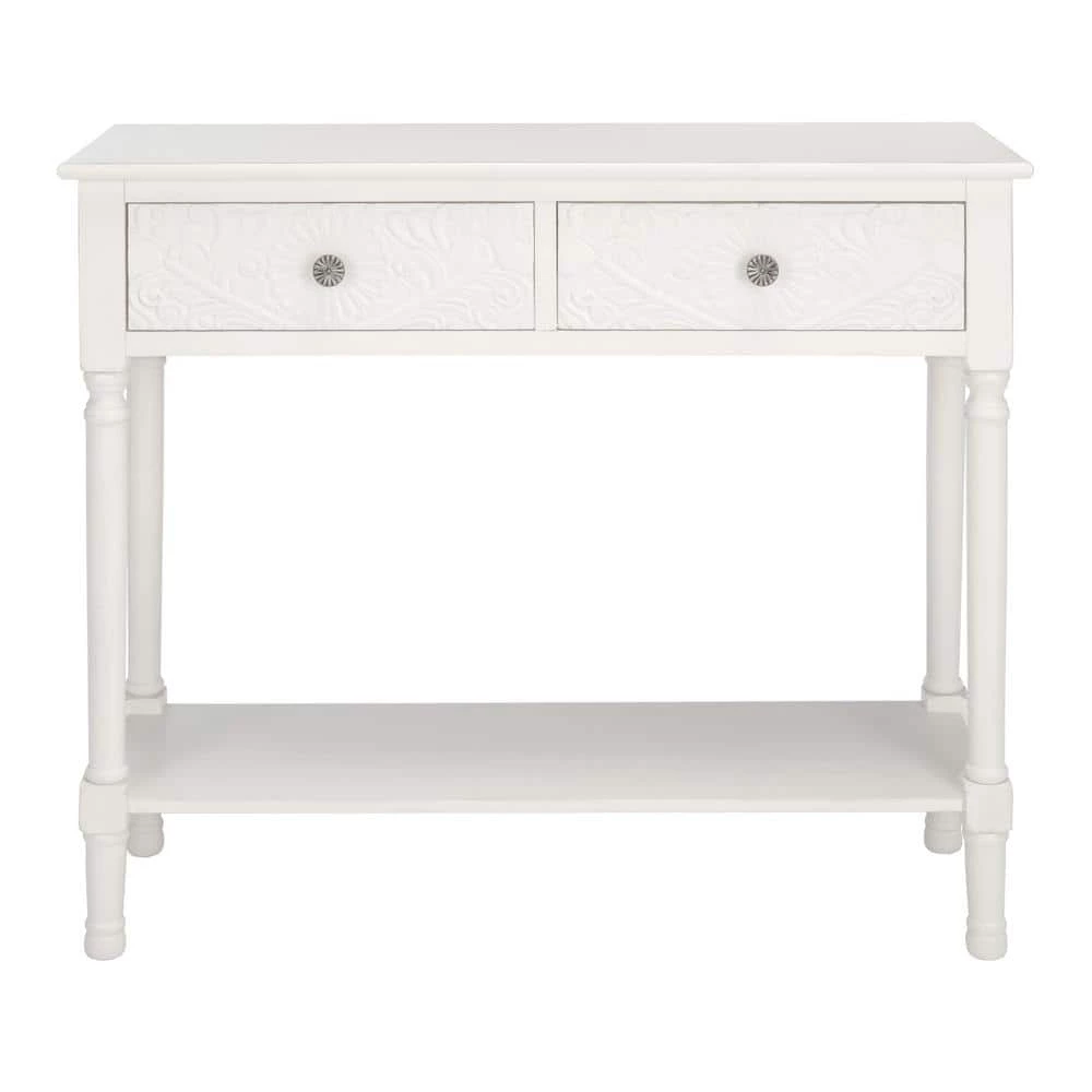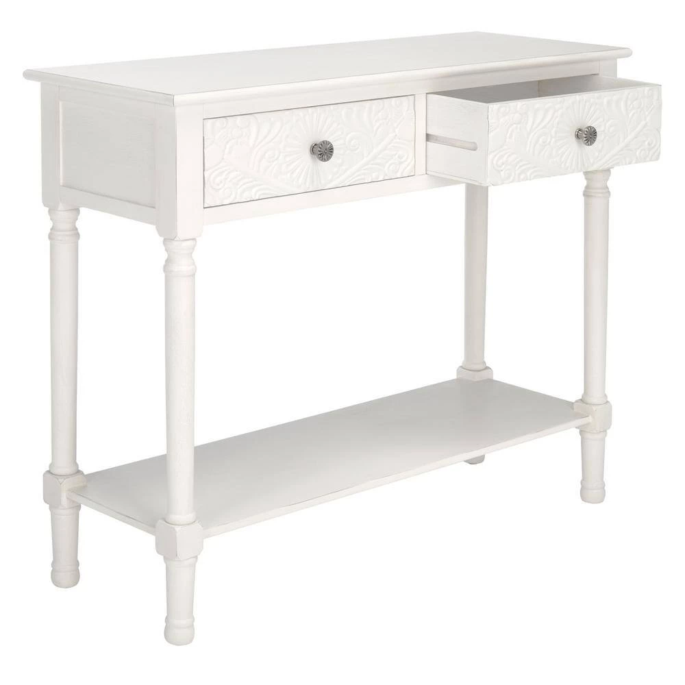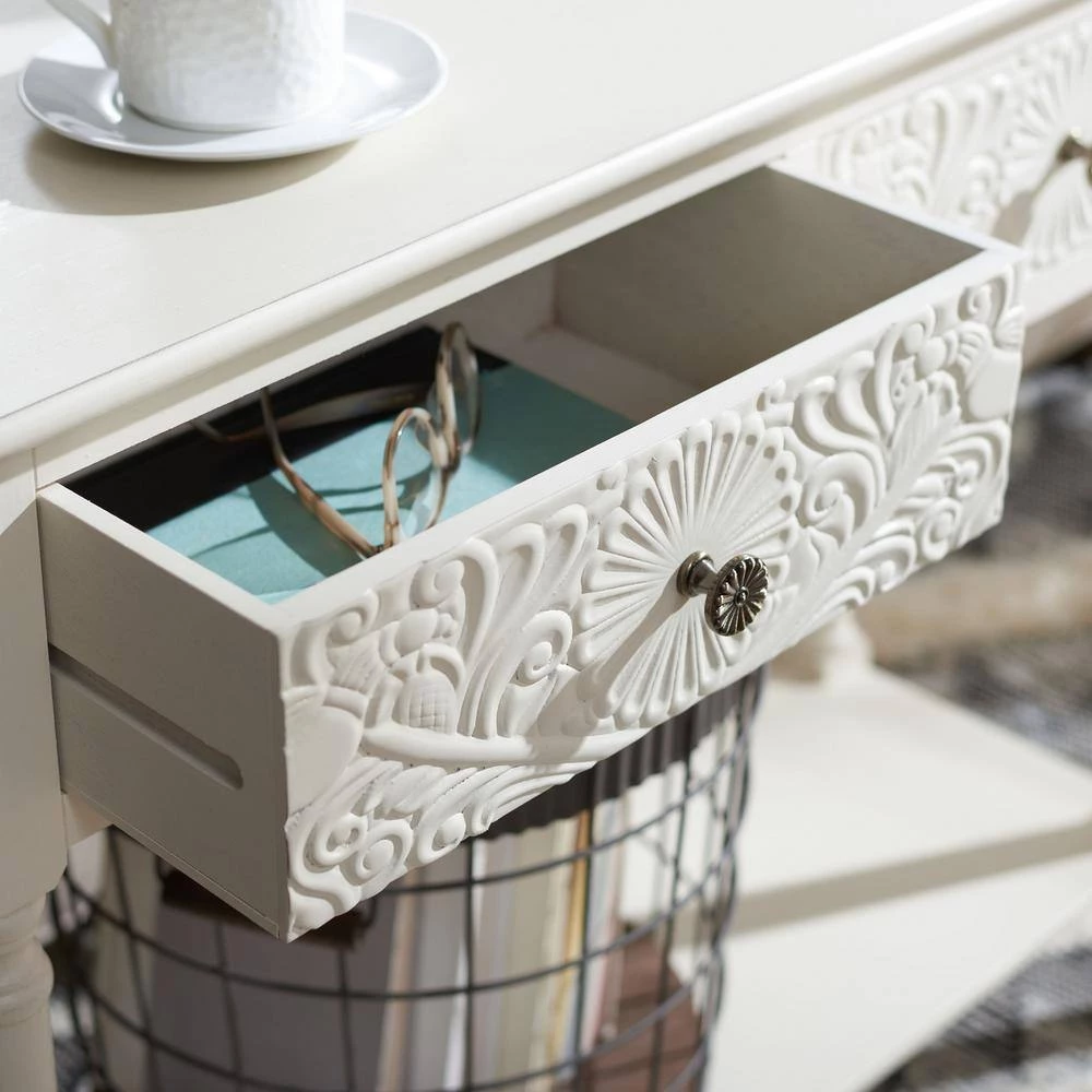 Revitalizing lavish Old World charm for today’s decor, this Josie Console Table is a striking centerpiece in any living room or entryway. Josie flaunts masterful artistry with meticulously carved florals on its 2-spacious drawers and a distressed white finish gives a modern touch to its classically styled frame. This is a great addition for your home whether you live in the country side or the busy city.