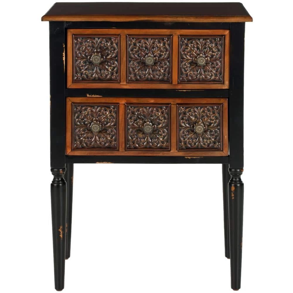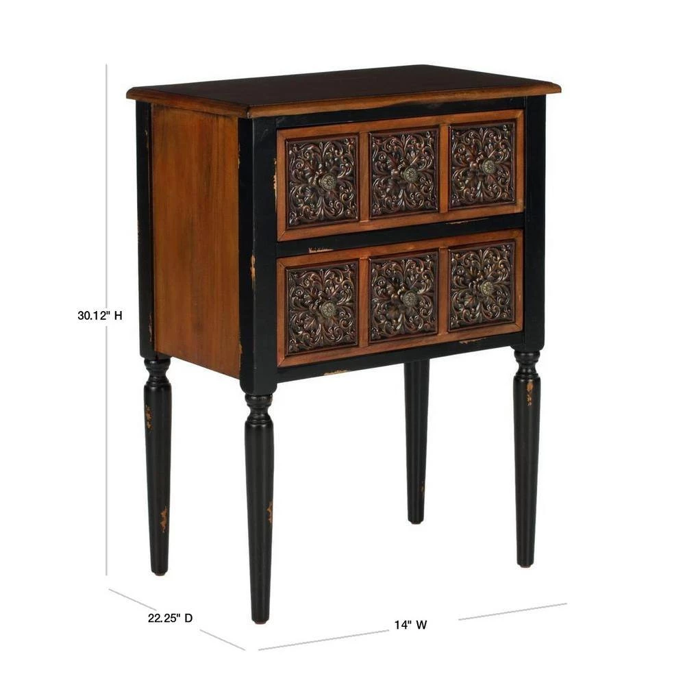 Mi casa es su casa. The Kenneth side table makes any room feel welcoming with its with carefully crafted tooled drawer facings inspired by Spanish and Mexican carved tables. Two-toned contrasting edging of this dark brown birch wood table gives its rustic southwestern facade added depth and charm. This is a great addition to your home whether in the country side or busy city.