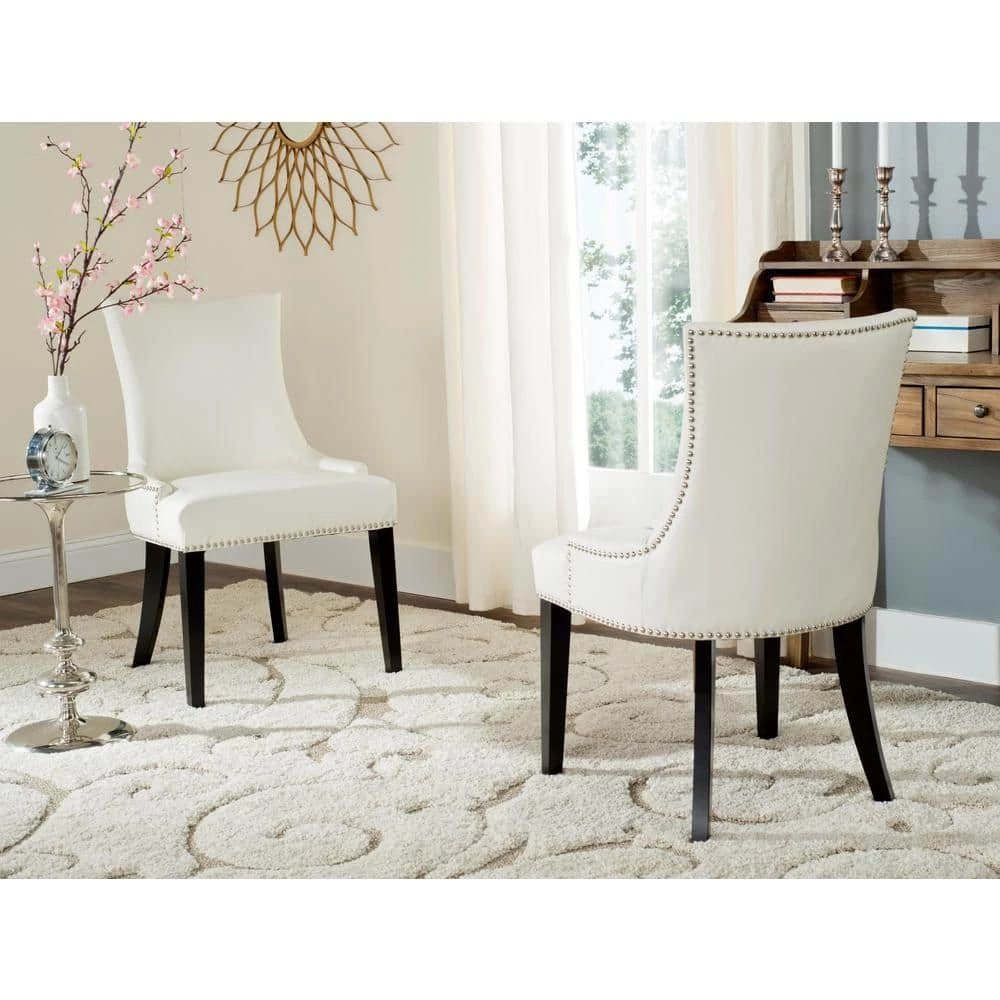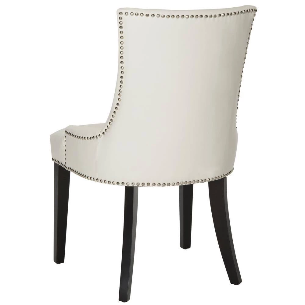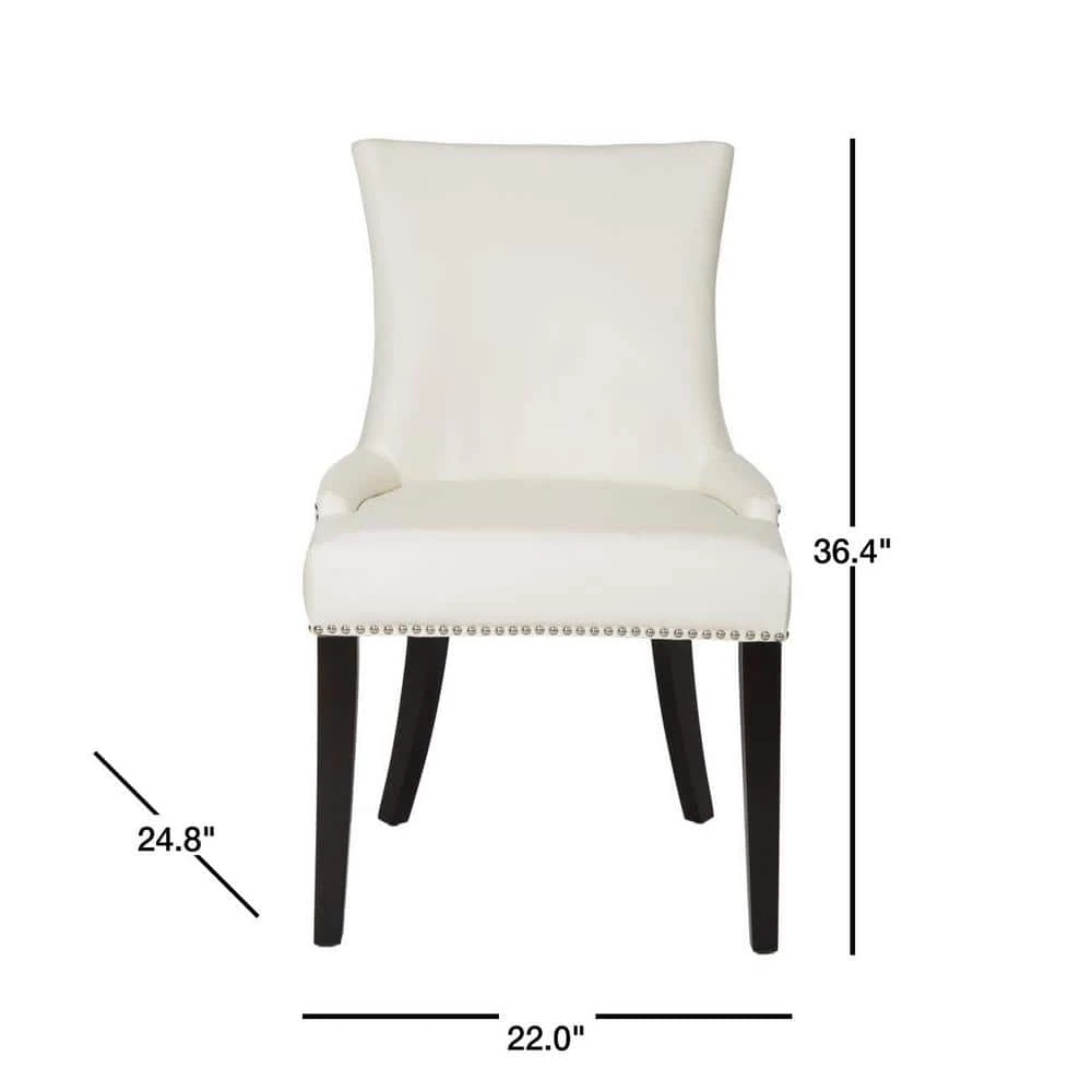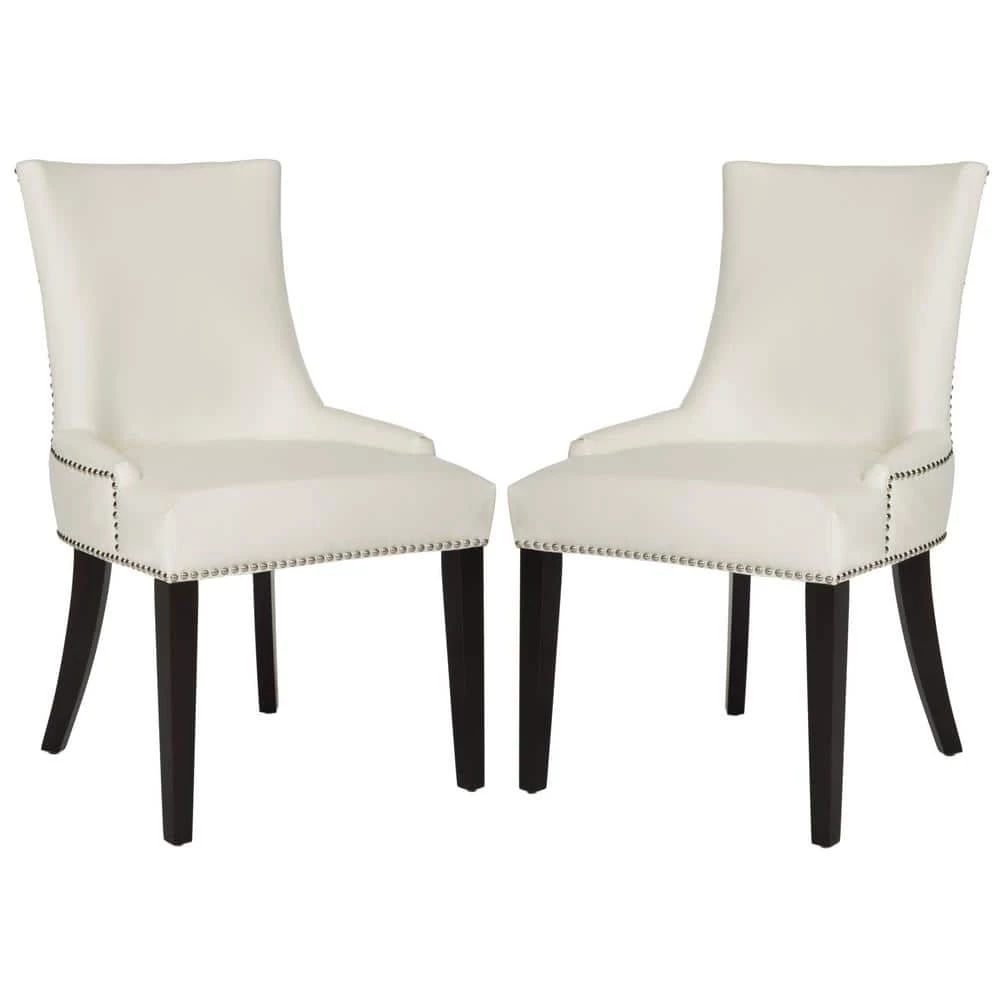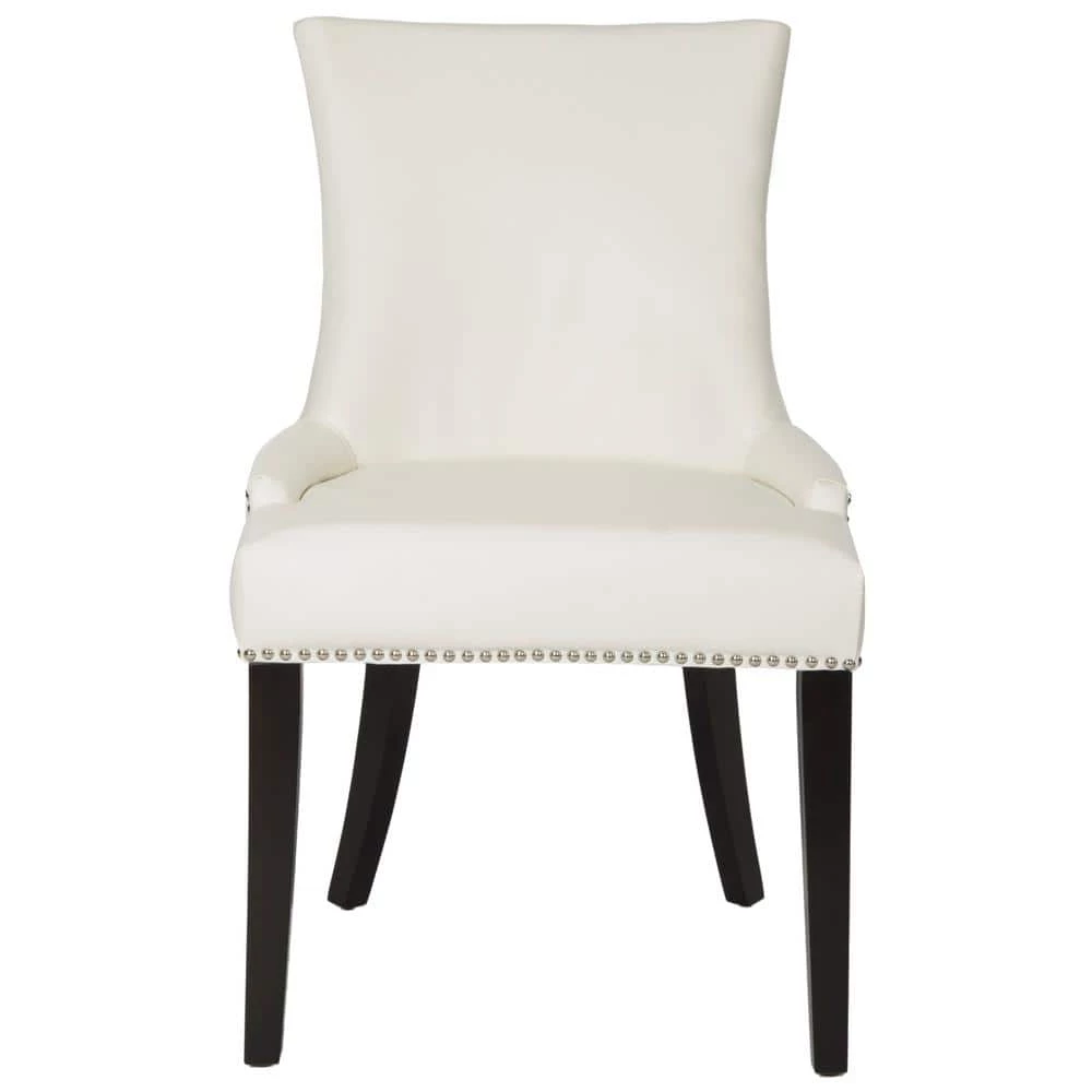 Low sloped arms and a slight hourglass shape to the seat back define this set of two dining chairs upholstered in cotton velvet in white bicast leather. Nailhead trim and birch legs in a chic espresso finish enhance a dining room with transitional flair. Whether country-chic or metro-mod, a great addition to any home.