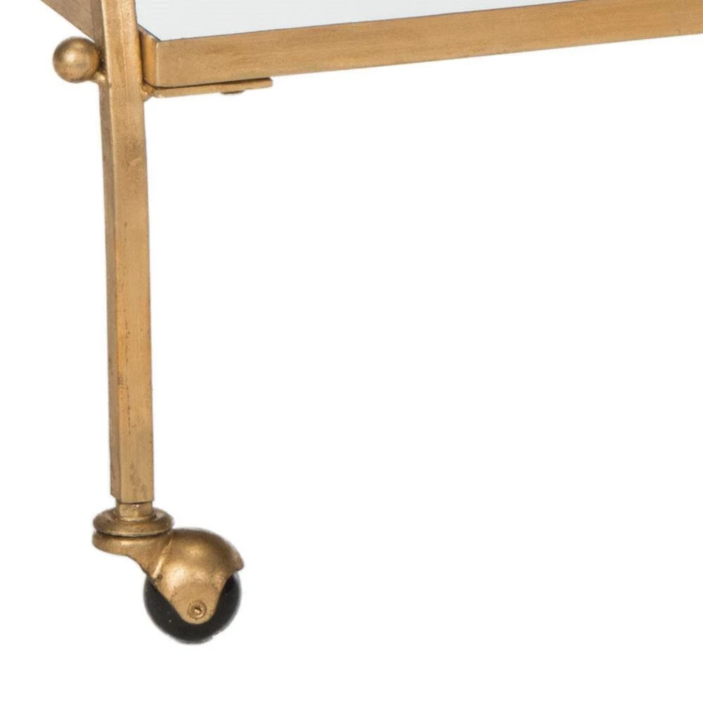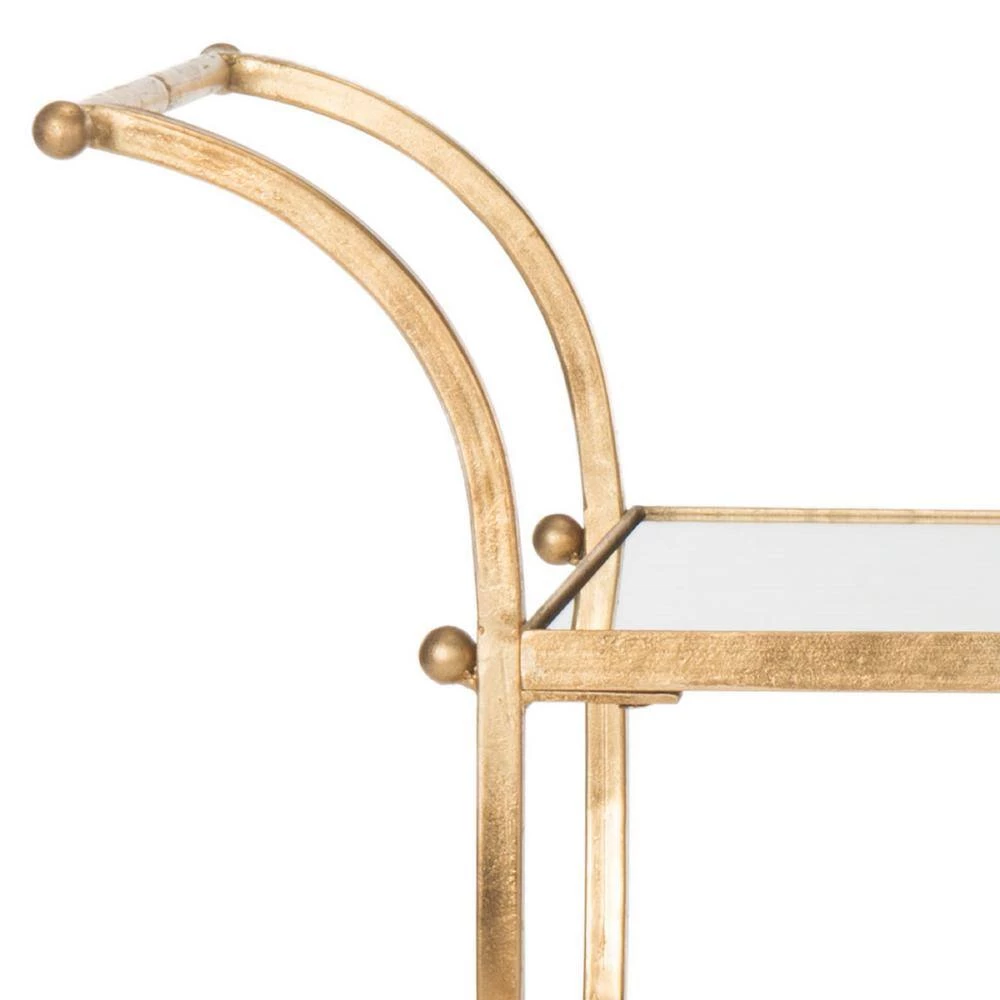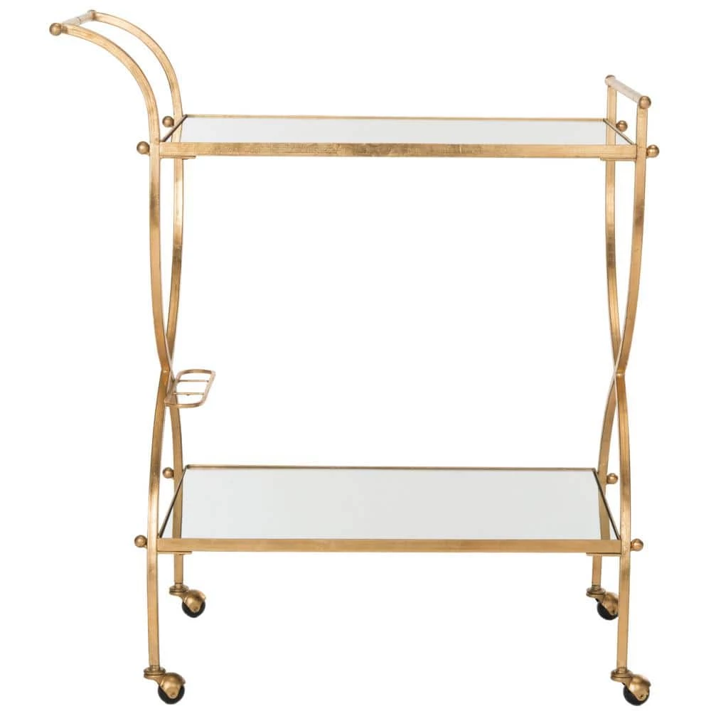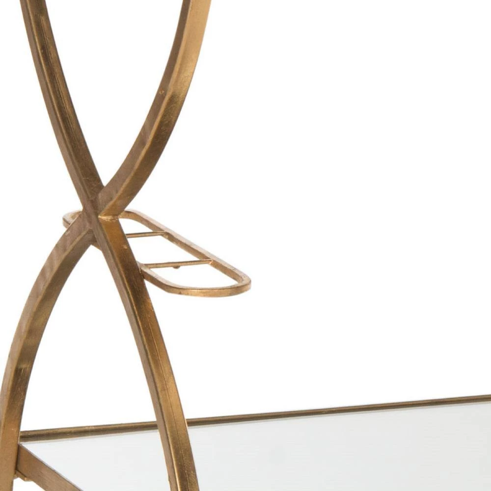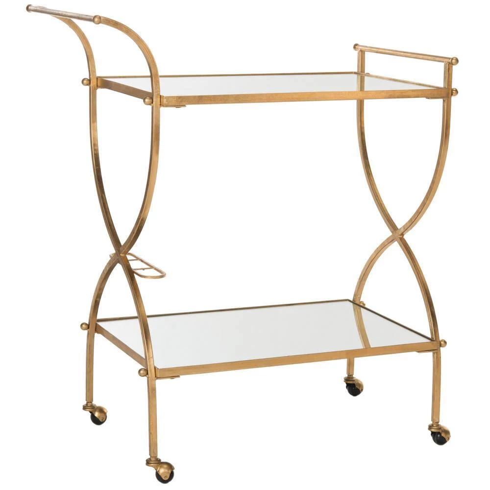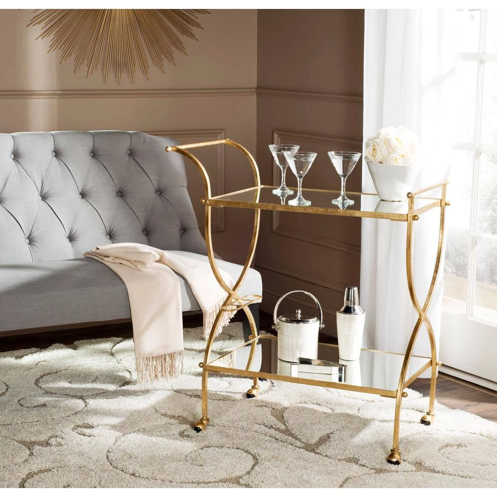 Restaurant-chic service can be yours at home with the portable Lucretius bar cart. Its graceful handles and elegant frame of beautifully forged iron in a lustrous gold finish are contrasted with mirrored glass shelves for barware, bottles and more. This is a great addition to your home whether you live in the country side or the busy city.