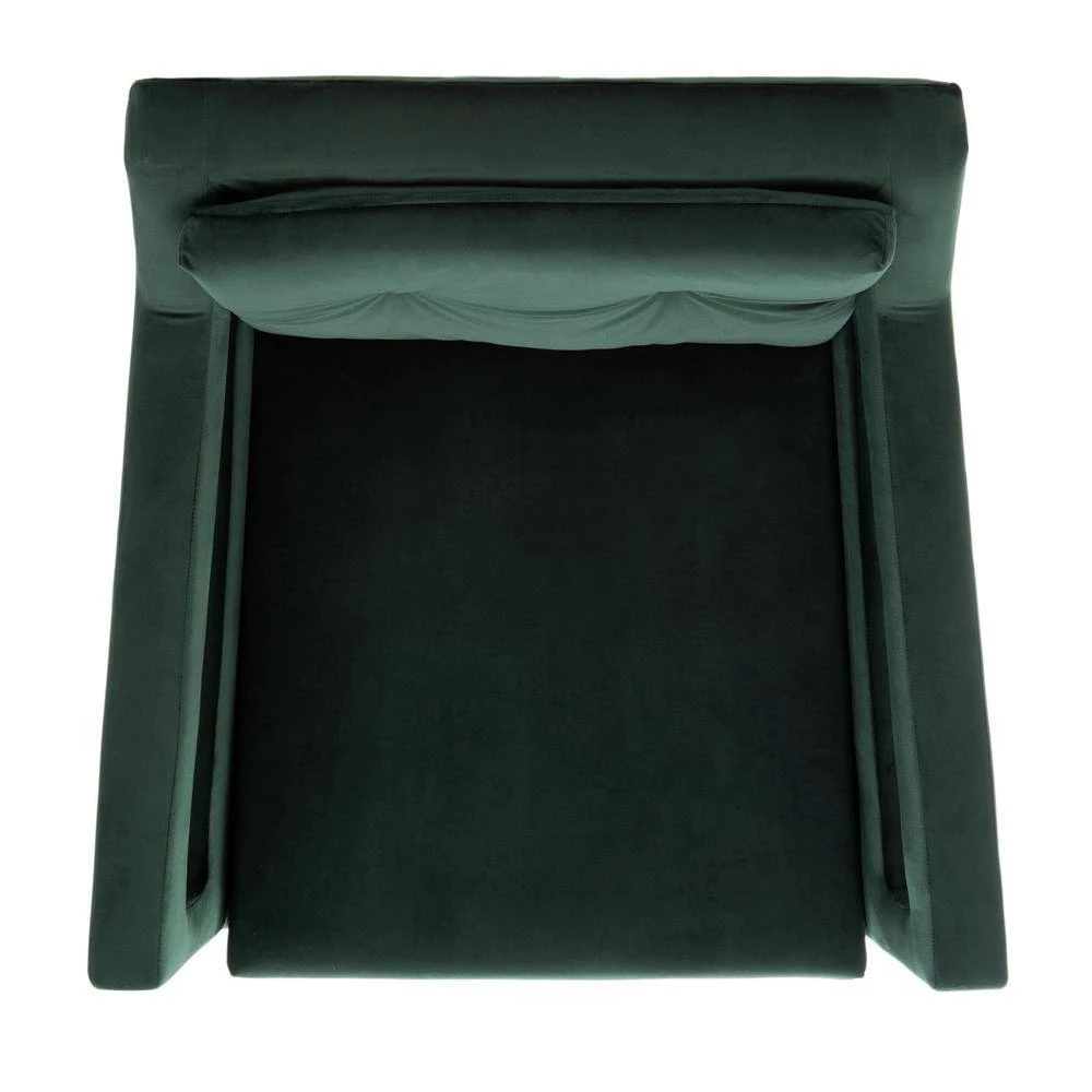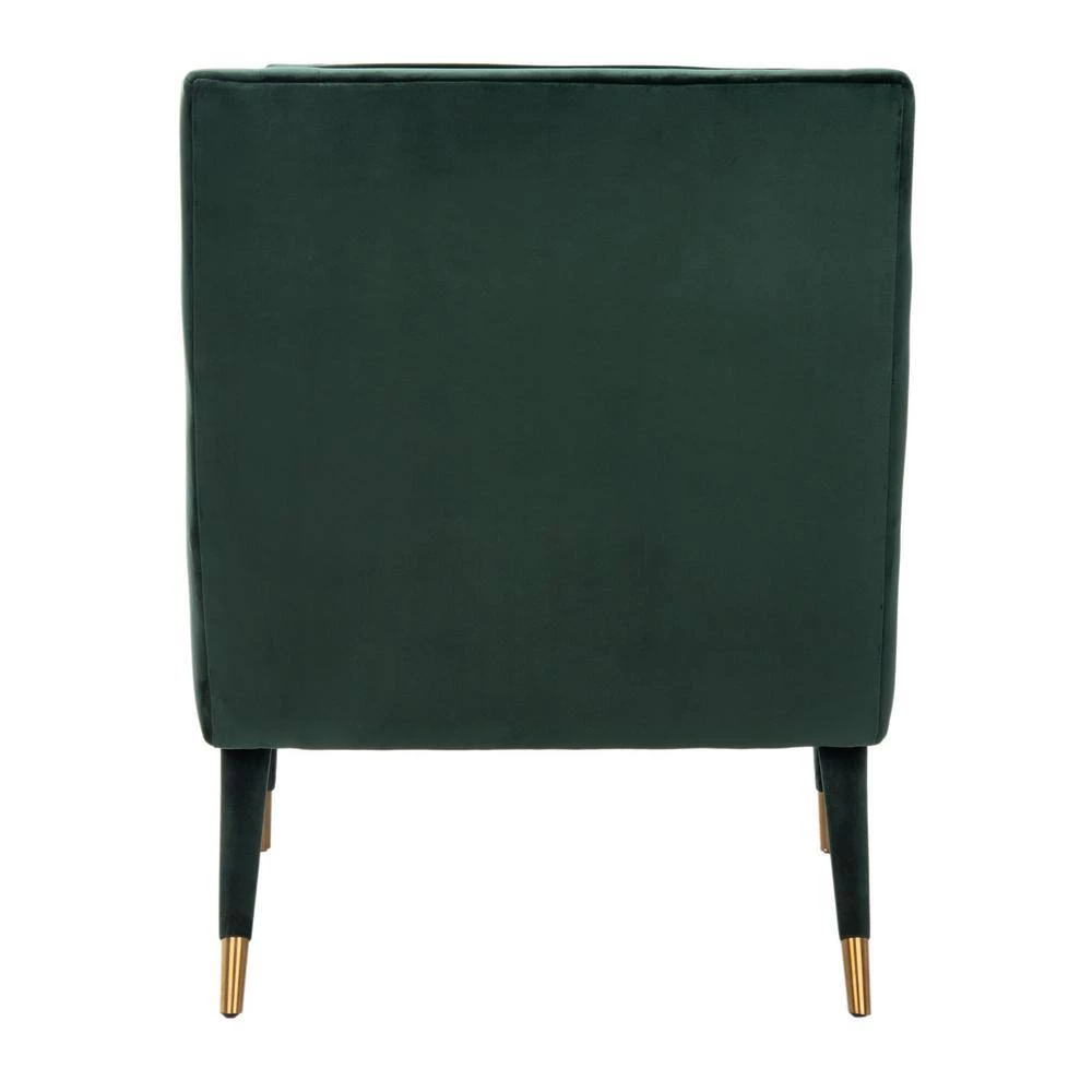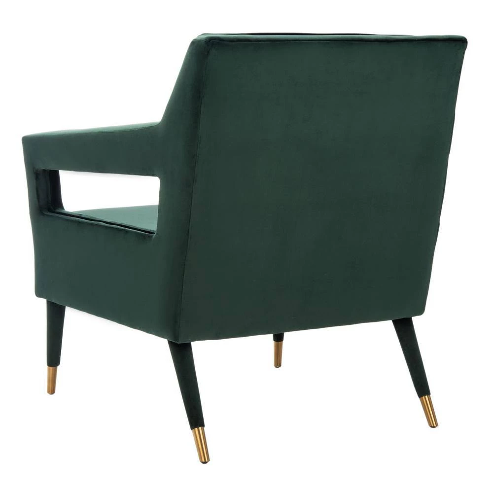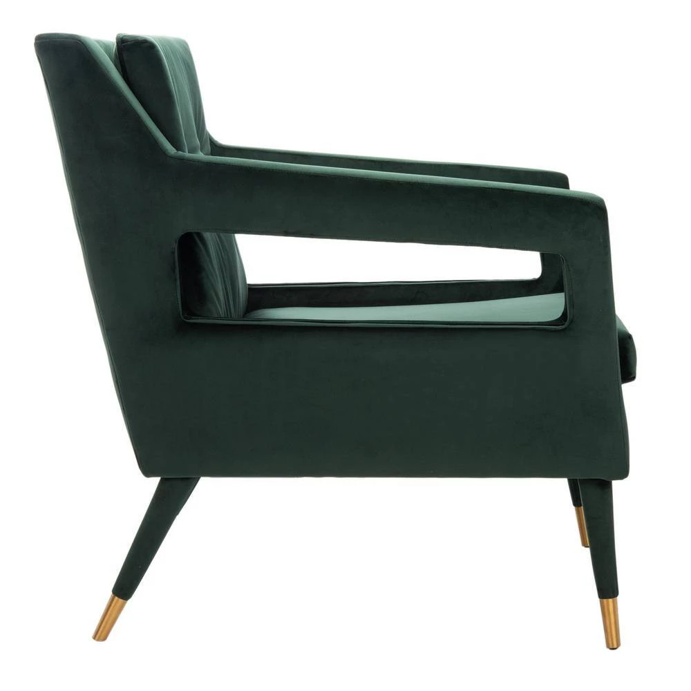 Designed for elegant and comfortable living, this Mara Accent Chair is a new classic. Mara’s uniquely angled silhouette and cut-out arms are softened by luxurious forest green velvet upholstery with button-tufted detail and the gold-finished caps on its black legs add radiant retro flair. A beautiful addition to your country home or modern house.