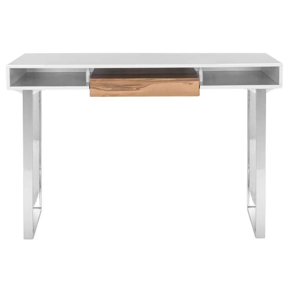 Essential clean lines and a slender form make a refined statement in the contemporary Emma writing desk. A polished steel frame serves as an elegant counterpoint to the white lacquer top and wood-finished desk drawer for stashing office essentials. This is a great addition for your home whether you live in the country side or the busy city.