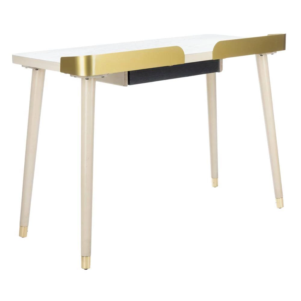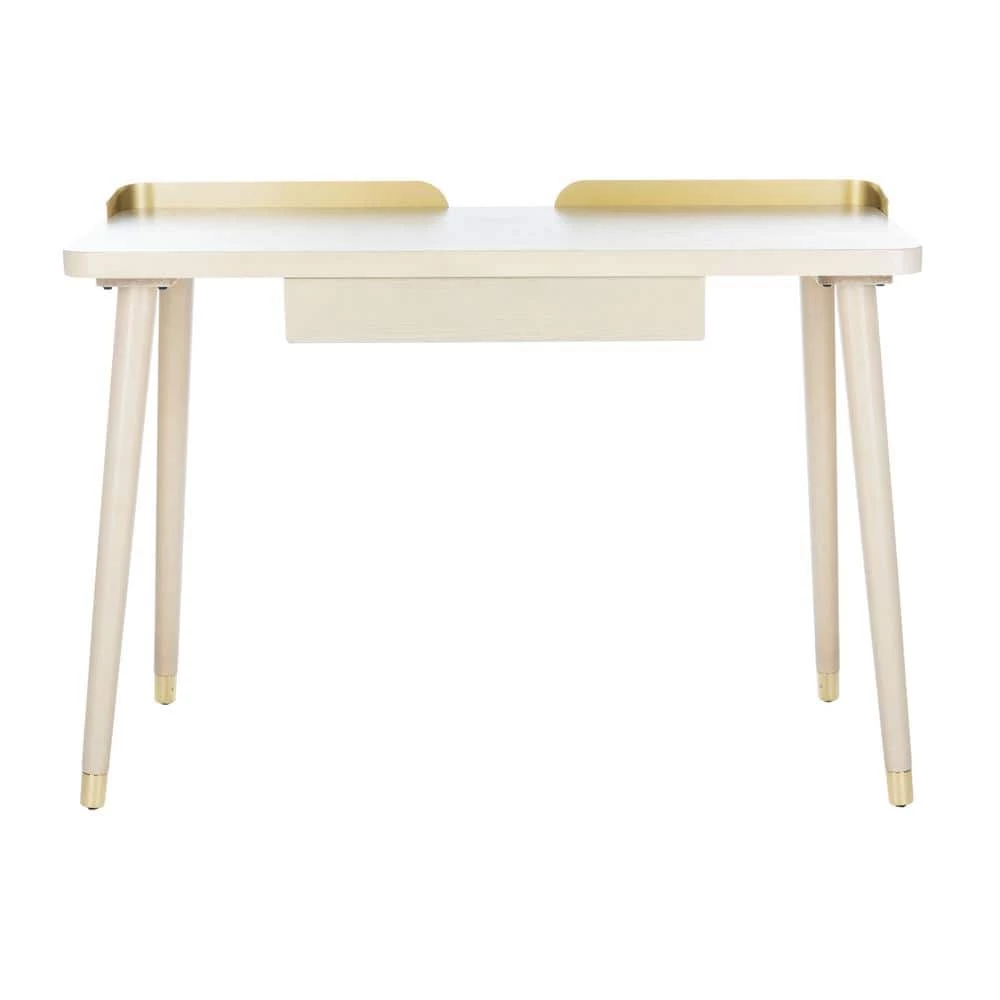 Bring the drama and character of vintage style to any home office with this modern 1-drawer desk. Meticulously crafted with an oak wood blend featuring a timeless white washed finish, its retro capped legs and gold details make it a new design classic. This is a great addition for your home whether you live in the country side or the busy city.