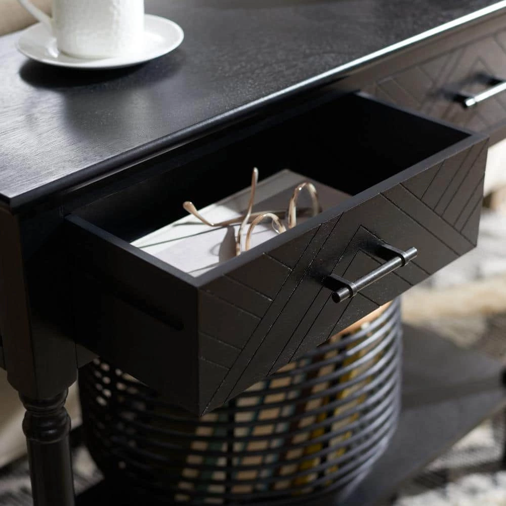 This Peyton Console is at once understated yet sophisticated, making it ideal for today’s classic-contemporary decor. Peyton’s open bottom shelf provides ample display space, while the oversized herringbone pattern on its 2-drawers gives a modern touch to Peyton’s carved wooden accents. This is a great addition for your home whether you live in the country side or the busy city.