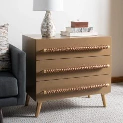 Bring natural style to the bedroom or living room with this contemporary 3-drawer chest or nightstand. Finely crafted with light brown wood and retro-style legs, its generous drawers feature pulls with faux leather accents in a complementary brown hue. A beautiful addition to your country home or modern house.