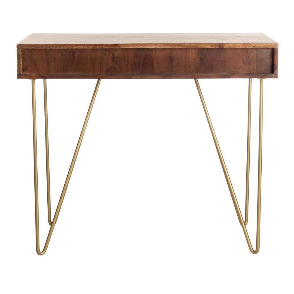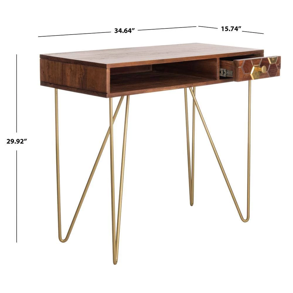 Make a bold style statement with this stunning Raveena Desk. Raveena’s warm walnut finish and asymmetric top is given a glamorous touch with a captivating, carved honeycomb pattern, glamorously highlighted with brass details that beautifully pair with matching hairpin legs. This is a great addition for your home whether you live in the country side or the busy city.