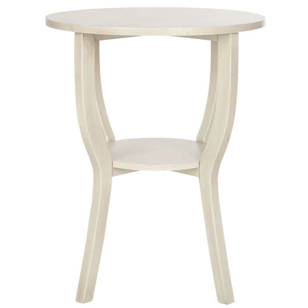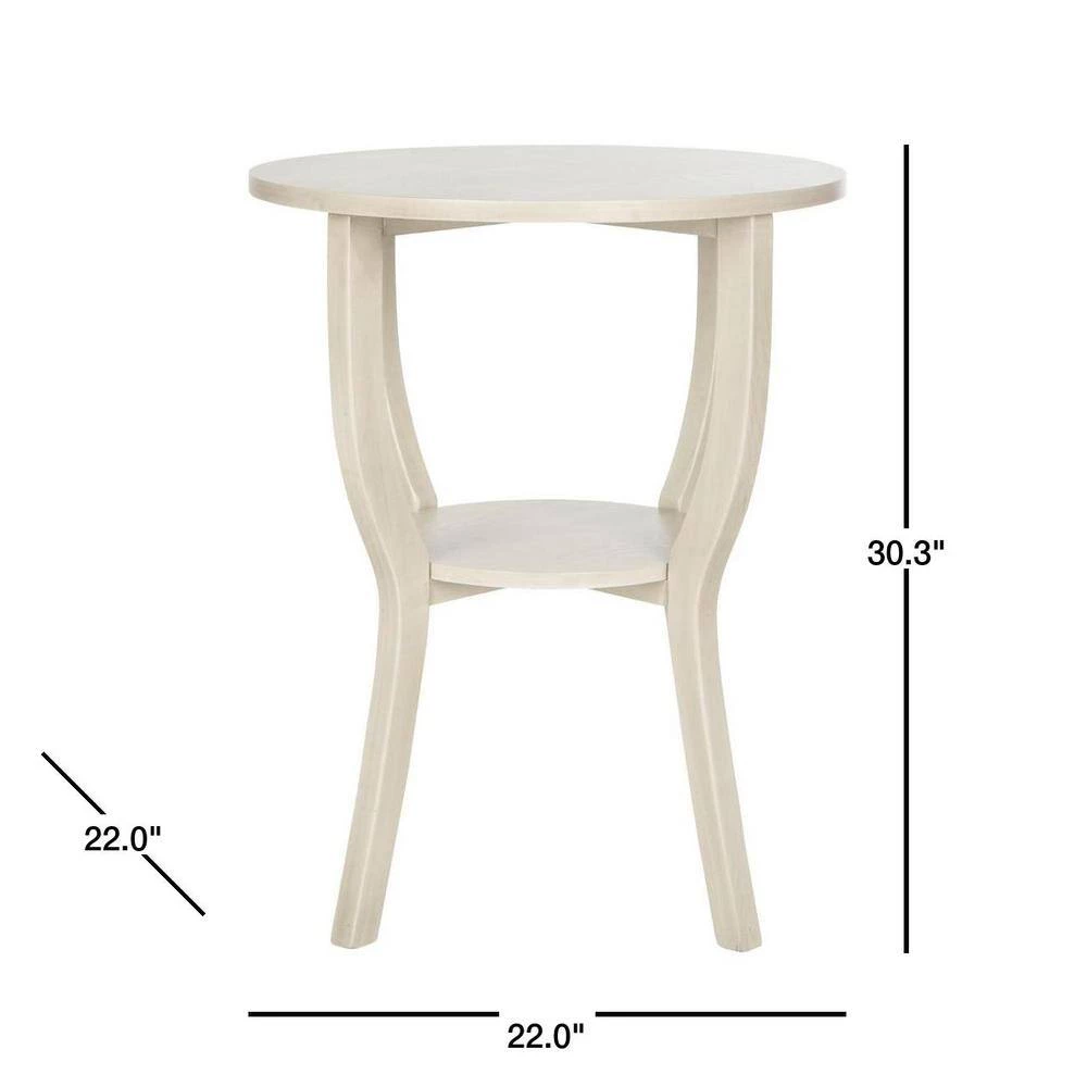 Brimming with country charm, the Rhodes accent table by Safavieh is pretty and practical beside a sofa or comfy chair. The table is crafted of elm wood with a whitewash finish. The round top of this table is paired with hour glass legs and useful storage shelf giving it a chic design. The Rhodes is a perfect companion for country homes, city apartments or formal manors.