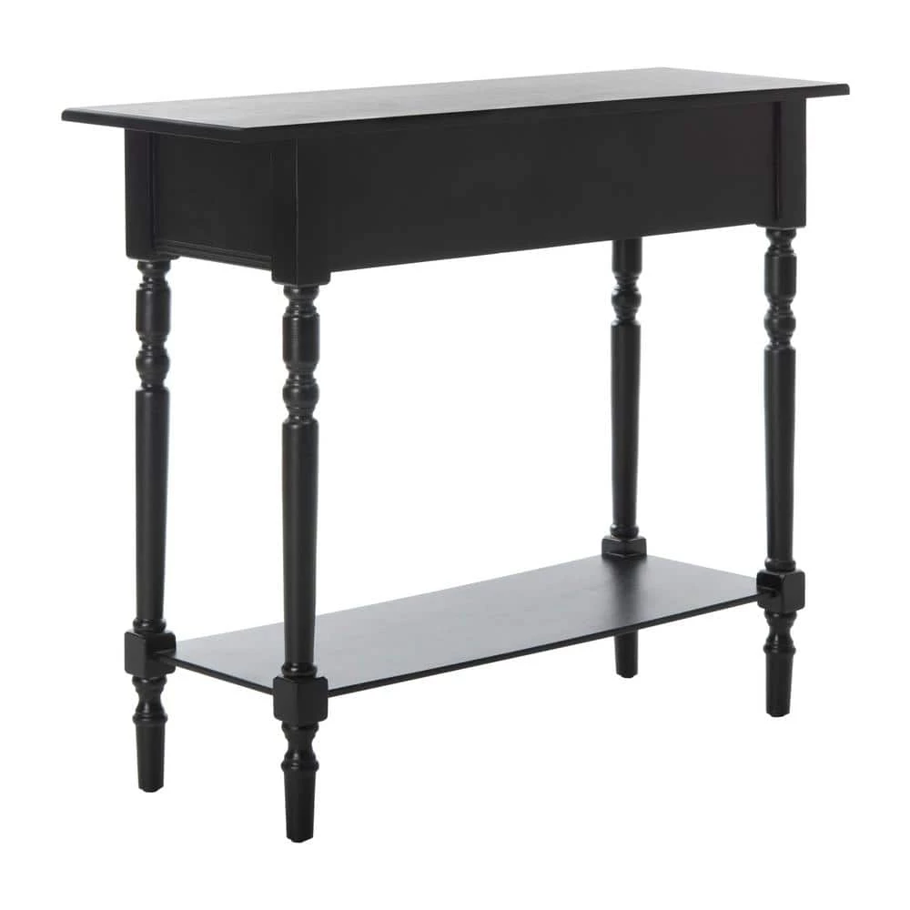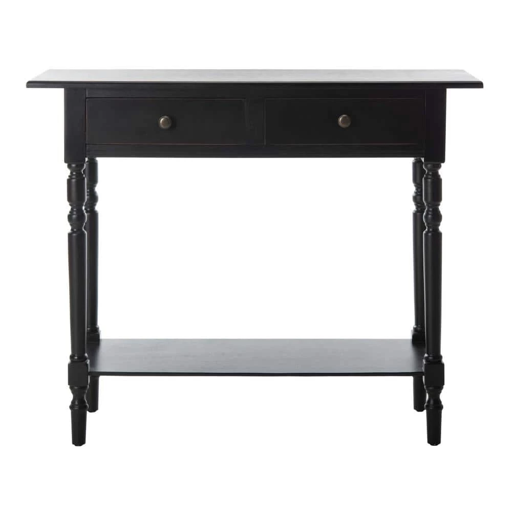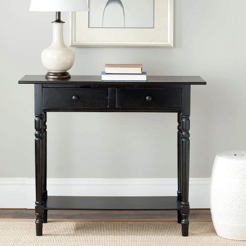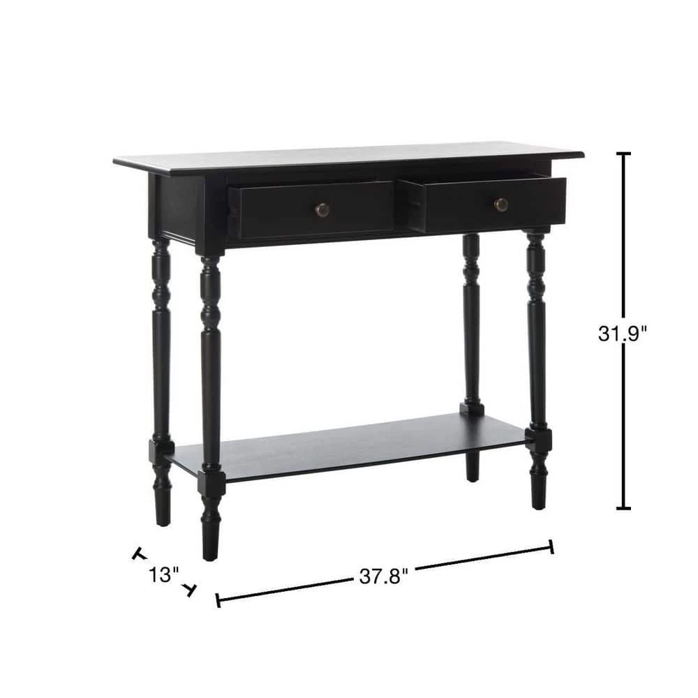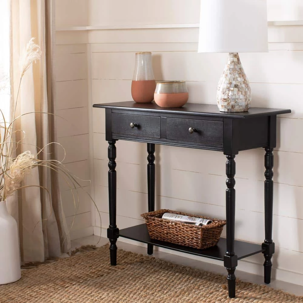 The Rosemary Console, in a distressed black finish, evokes craftsman style with its clean lines and practical storage. Crafted from pine with two drawers and a bottom shelf, this console will enhance casual dens, front entry, or bedrooms with its refined farmhouse charm. This is a great addition for your home whether you live in the country side or the busy city.