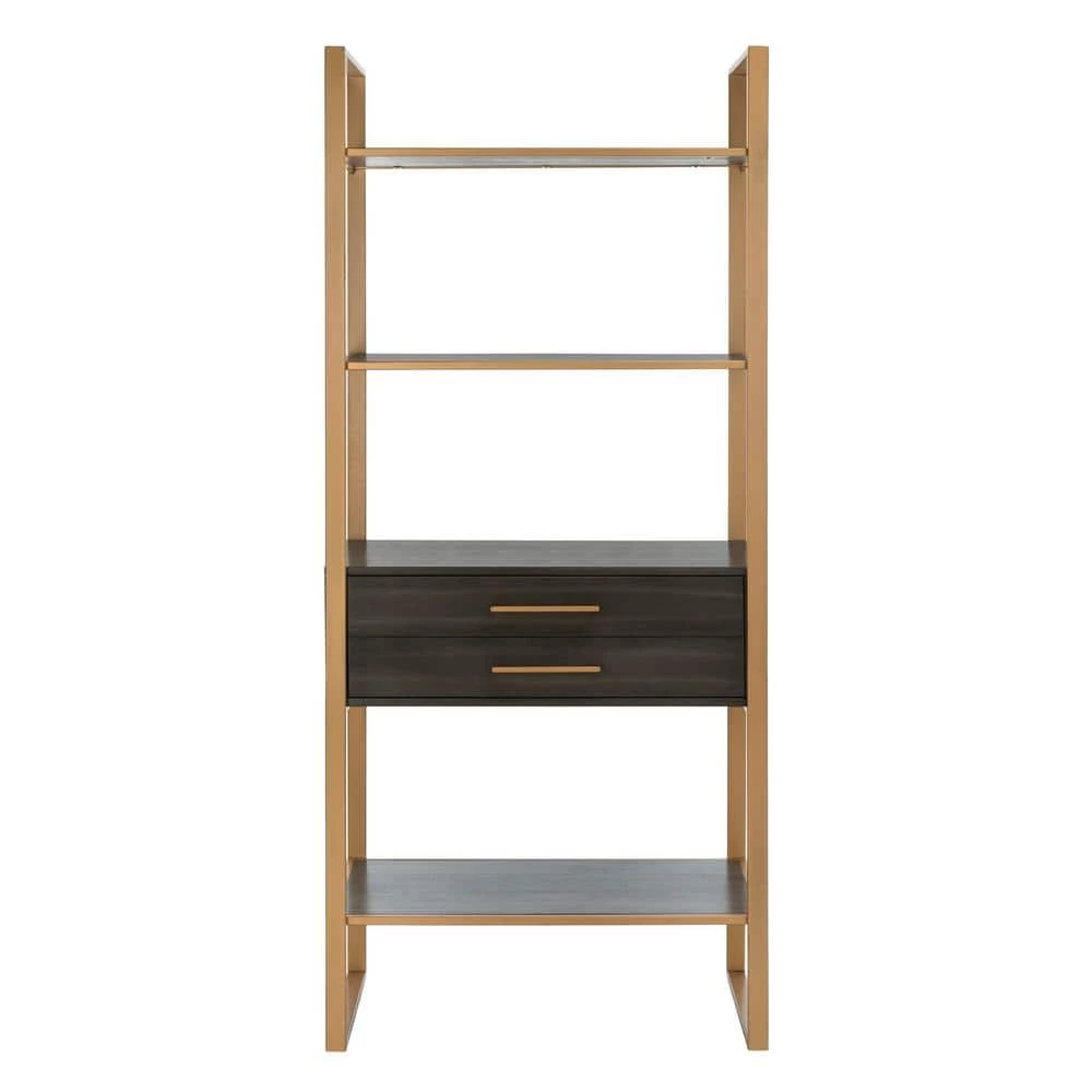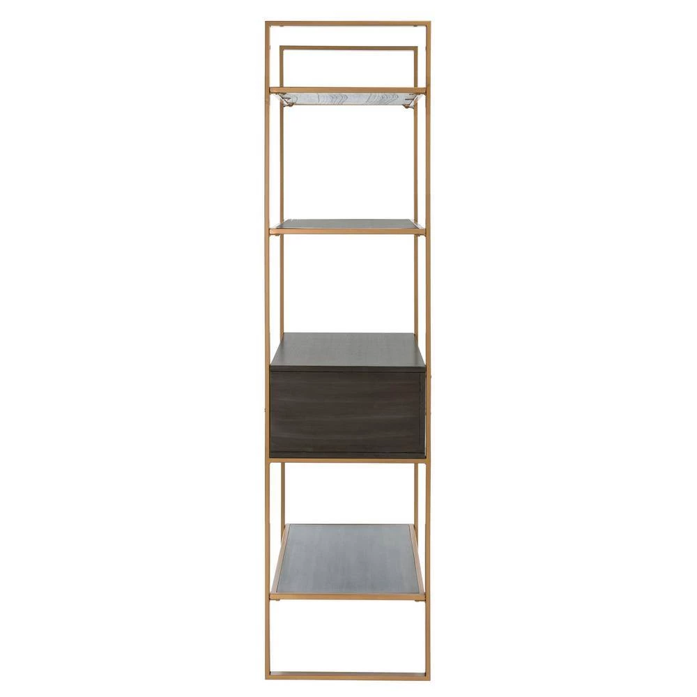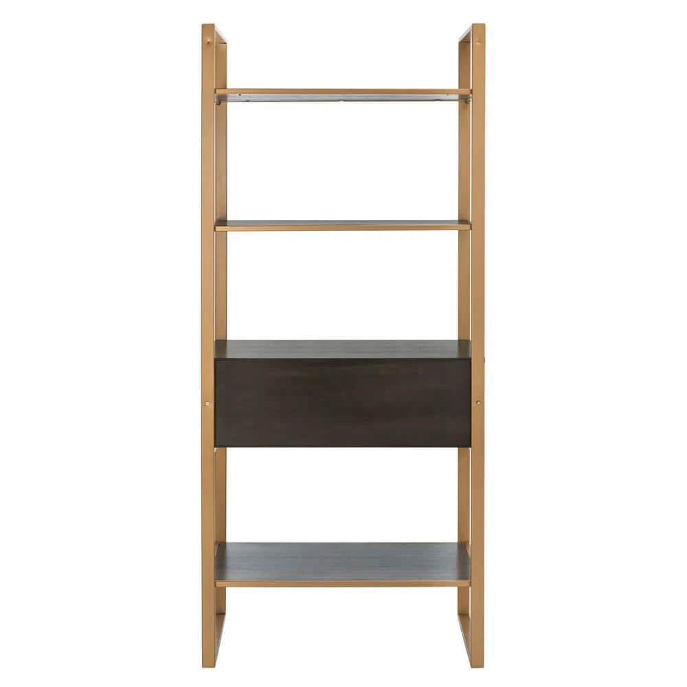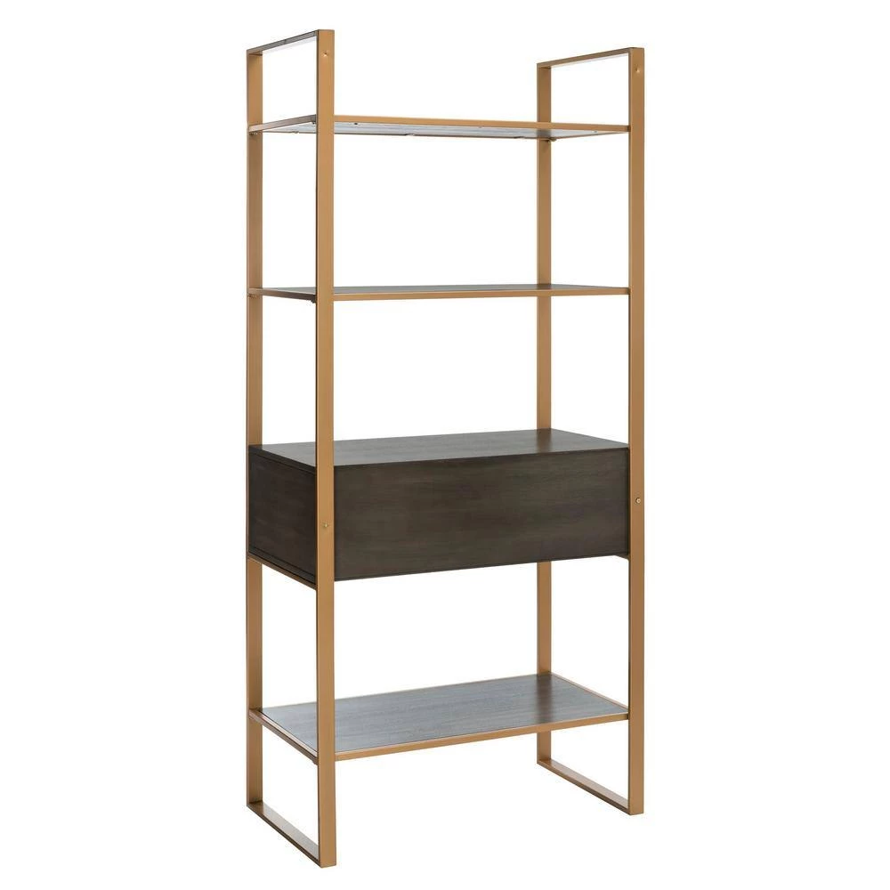 Tall, dark and handsome, this 4-tier tagre with one drawer is a modern classic. Its bold frame features geometric lines illuminated by a sophisticated gold finish. The grey oak hue of its open shelves and ample storage drawer updates any living room.