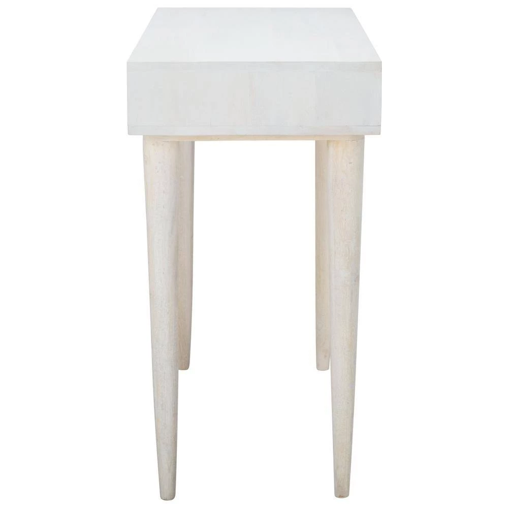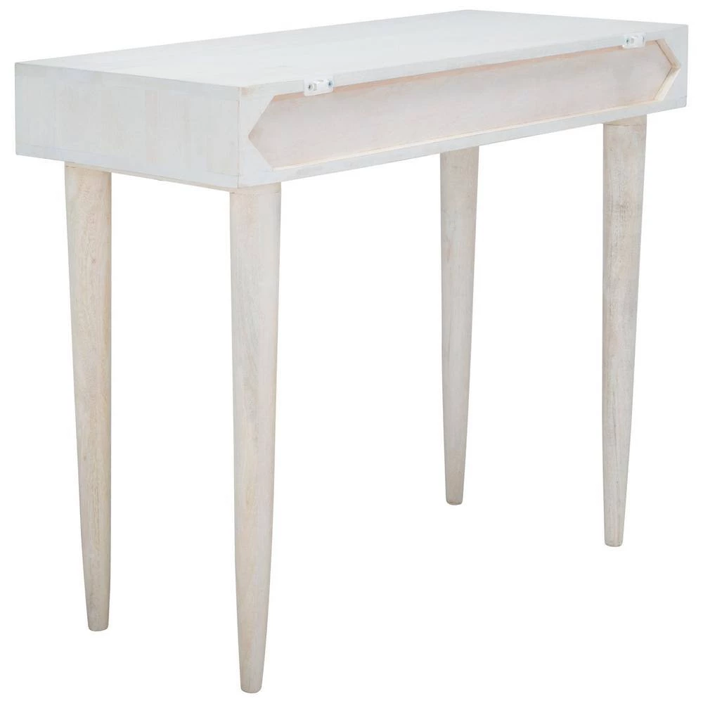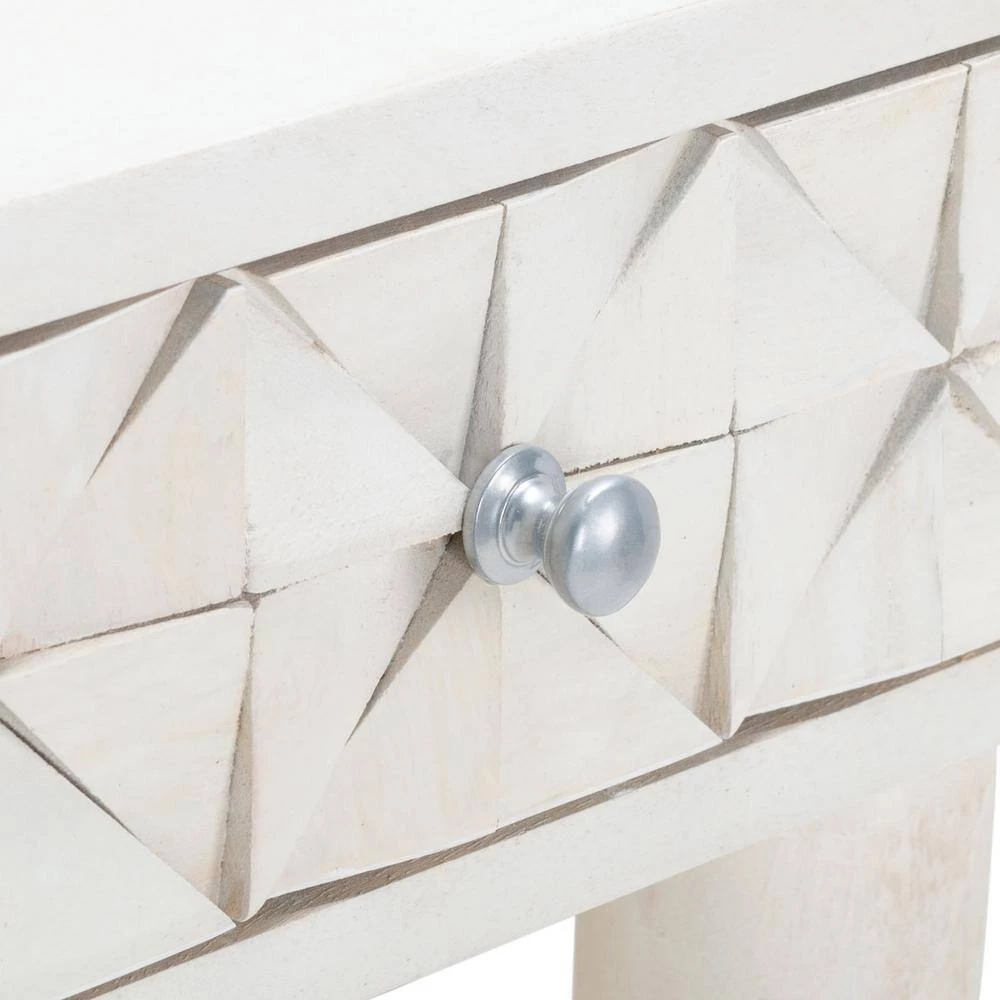 This Zinnia Desk flaunts a distinct couturier look with its finely carved geometric details and artful asymmetry. Ideal for the living room or home office, Zinnia’s mango wood frame is stunning in a whitewash finish that highlights its open shelf and tapered legs. Silver hardware adds a glamorous touch. Perfect addition for any home office or workspace.